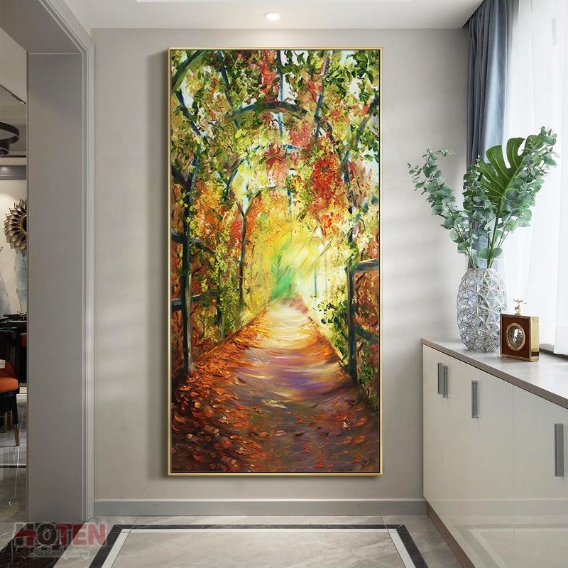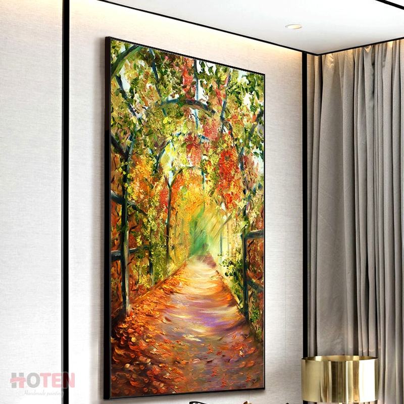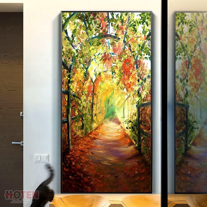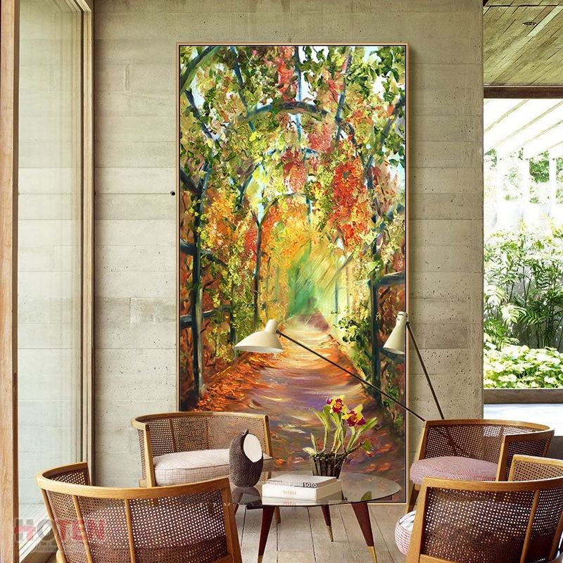 ภาพวาดสีน้ำมันวาดด้วยมือที่ทันสมัยกำหนดเองภูมิทัศน์สวนสวยด้วยดอกไม้สำหรับห้องนั่งเล่นผ้าใบตกแต่งผนัง