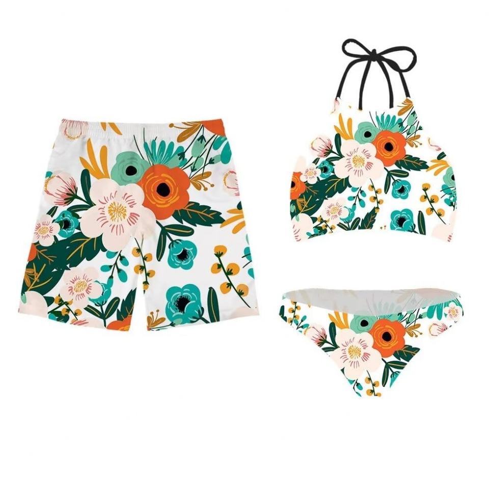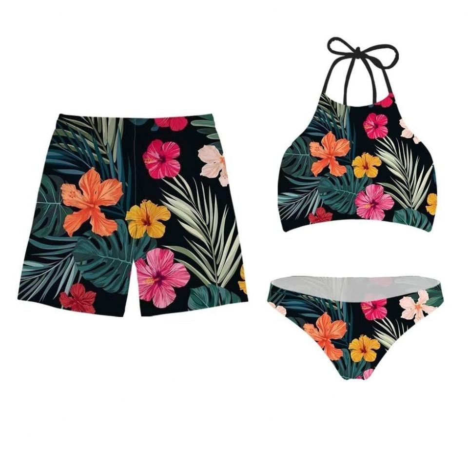 ชุดว่ายน้ำคู่รักสุดหรูแบบพิมพ์ลายเอง MOQ 50 ชิ้น ชุด 3 ชิ้น บิกินี่แบบผูกเชือก ชุดชายหาด กางเกงว่ายน้ำชาย กางเกงขาสั้นสำหรับผู้หญิง