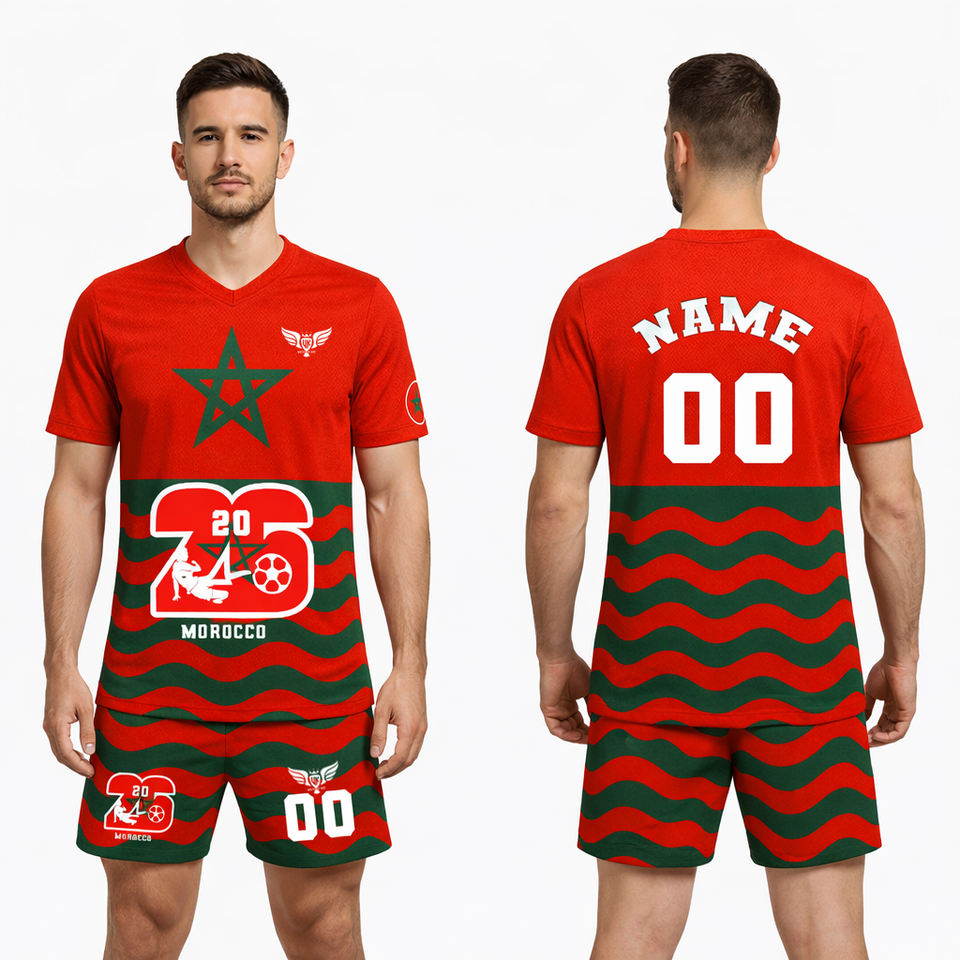 ชุดฟุตบอลสไตล์โมร็อกโกแบบกำหนดเองสำหรับผู้ชาย ชุดยูนิฟอร์มฟุตบอลปี 2026 ชุดทีมแบบกำหนดเอง เสื้อผ้ากีฬาระบายอากาศดี ขายส่ง สหรัฐอเมริกา ยุโรป