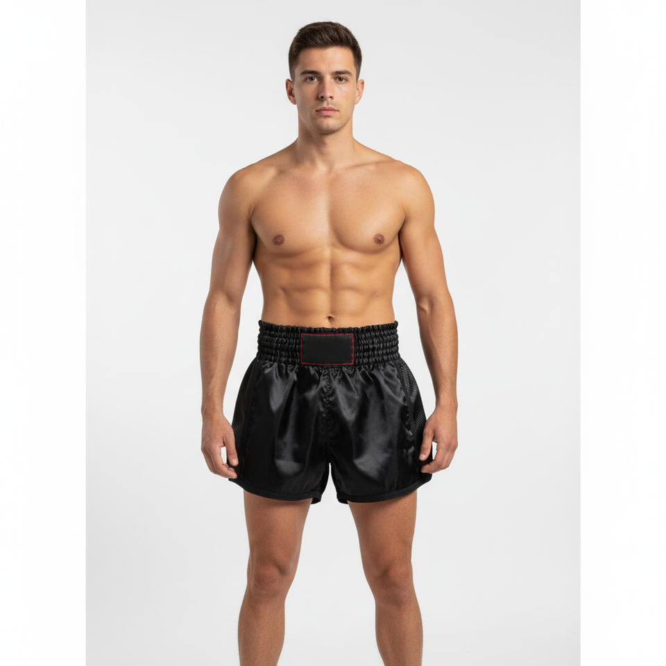 กางเกงขาสั้นมวยไทยแบบปรับแต่งได้สำหรับทุกเพศสีดำ100% โพลีเอสเตอร์สแปนเด็กซ์ระบายอากาศได้ดีพิมพ์ซับลิเมชันแห้งเร็ว220กรัม