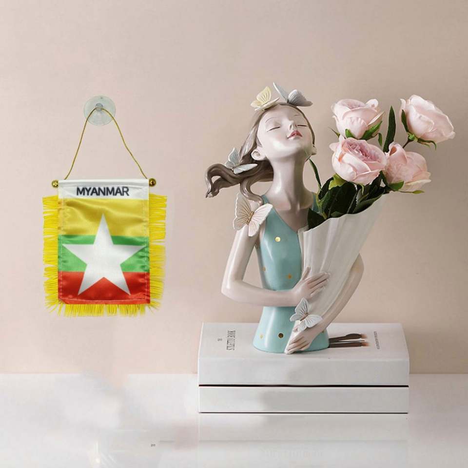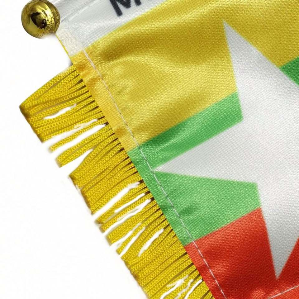 ธงมินิผ้าซาตินพิมพ์ลายดิจิทัลแบบกำหนดเองของเมียนมา พร้อมพู่สีเหลืองสำหรับตกแต่งรถยนต์