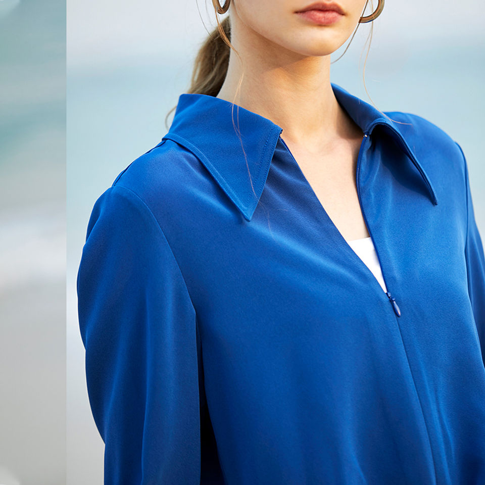 เสื้อเชิ้ตทำงานแขนยาวผู้หญิง รุ่น Custom NAVY 2025 ผ้าซาตินเนื้อนุ่ม ระบายอากาศดี ทรงปกติ สีพื้น ติดกระดุมและซิป