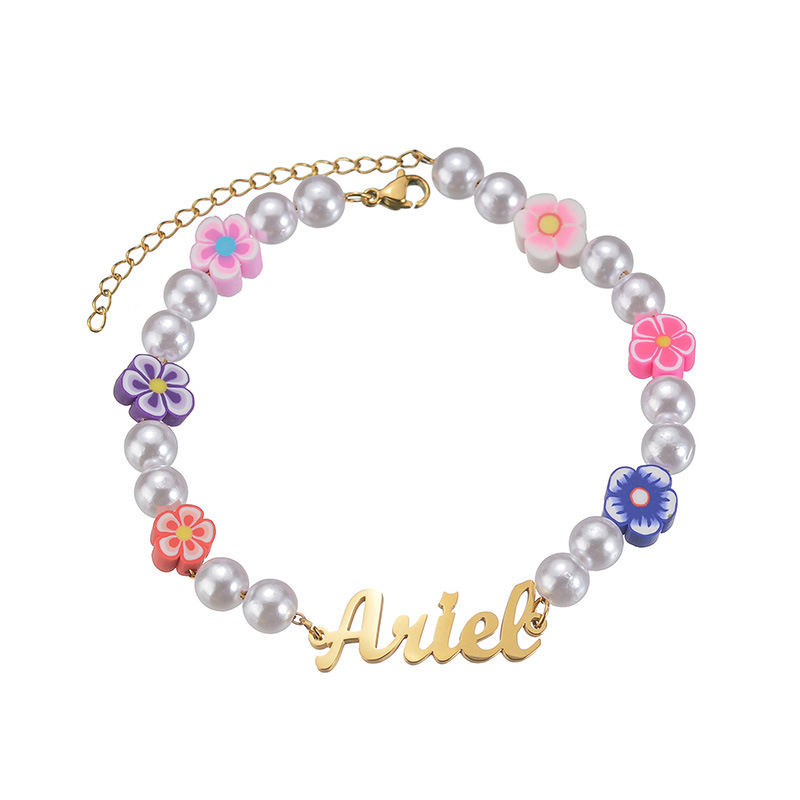 Custom Name Bar Gold Plated Polymer Clay Flower Pearl Stainless Steel Bracelet Personalized Anniversary Gift for Women Men