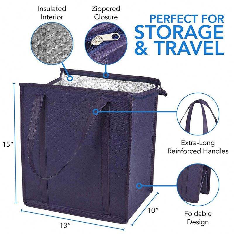 กระเป๋าใส่อาหารแบบพกพา สีน้ำเงินกรมท่า ทำจากผ้าไม่ถักทอ เก็บความร้อนได้ ใช้ซ้ำได้ ลายตัวอักษร