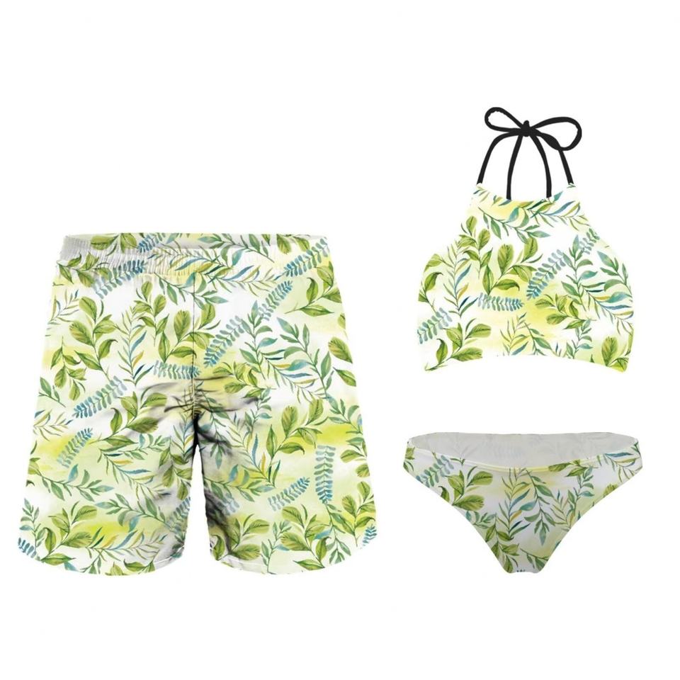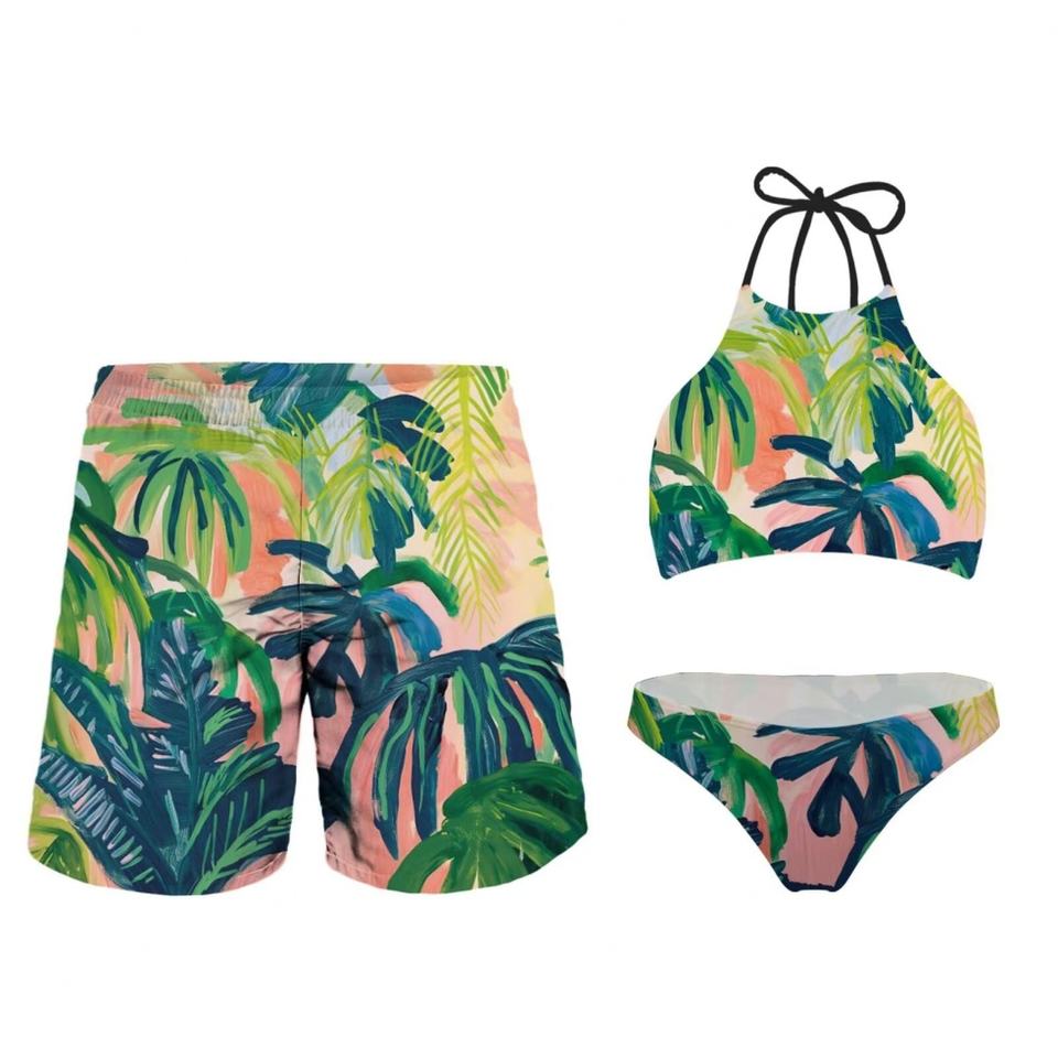 ชุดว่ายน้ำคอปกแบบกำหนดเอง 3 ชิ้น สำหรับคู่รัก กางเกงขาสั้นผู้ชาย บิกินี่ผู้หญิง ชุดชายหาด ชุดบิกินี่ผู้หญิง