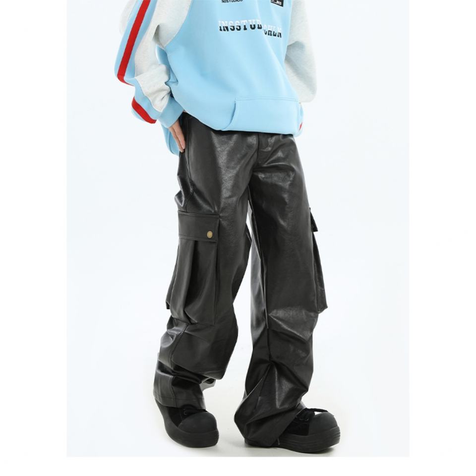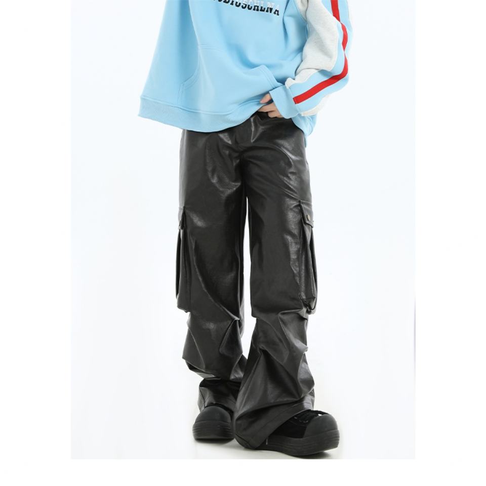 กางเกงหนังทรงหลวมแฟชั่นใหม่สำหรับผู้ชาย สไตล์มอเตอร์ไซค์ จีบชายกางเกง กระเป๋าหลายช่อง กางเกงคาร์โก้ผู้ชาย
