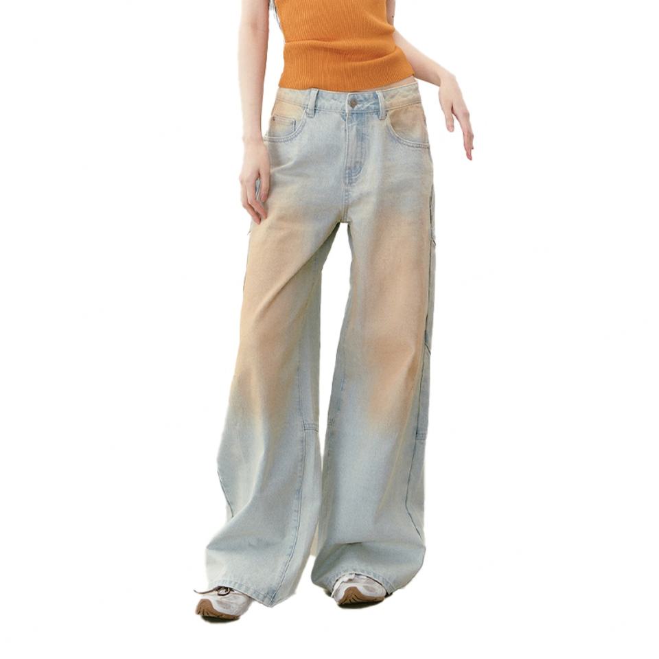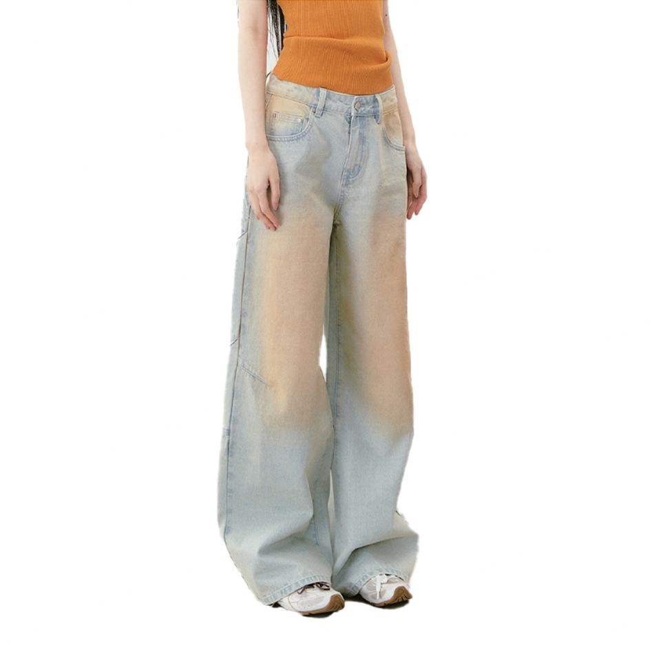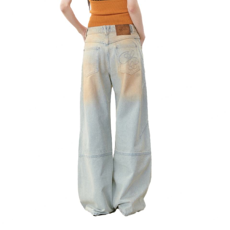 กางเกงยีนส์แฟชั่นใหม่สไตล์วินเทจทรงหลวมสำหรับผู้หญิง ผ้าฝ้าย 100% คุณภาพสูง ลุค Dirty Washed พร้อมกระเป๋าปักลาย