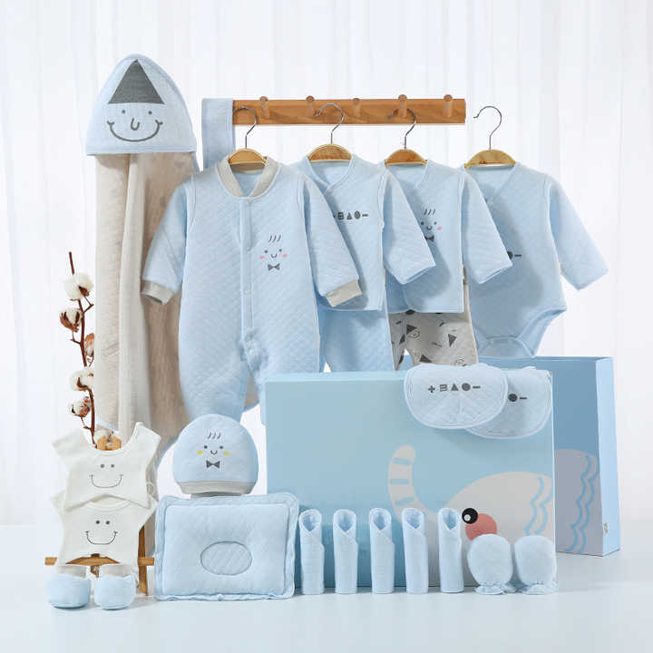 ชุดของขวัญสำหรับเด็กแรกเกิด ผ้าฝ้ายแท้ ชุดลำลอง 18 ชิ้น 21 ชิ้น 23 ชิ้น ชุดเสื้อผ้าเด็กแรกเกิด สีฟ้า