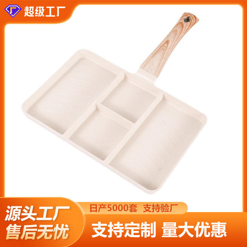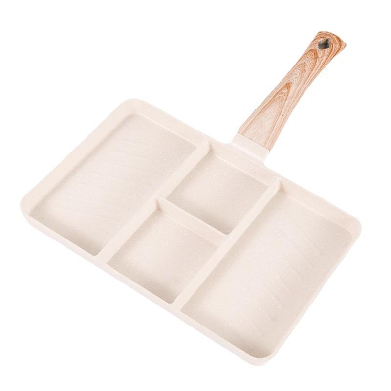 กระทะหินไมแฟนเคลือบกันติดแบบสั่งทำพิเศษ รูปทรงสี่เหลี่ยม แบ่งสี่ช่องสำหรับทอดไข่ สเต็ก ใช้งานได้หลากหลาย เหมาะสำหรับทำอาหารเช้า ใช้ล้างมือเท่านั้น
