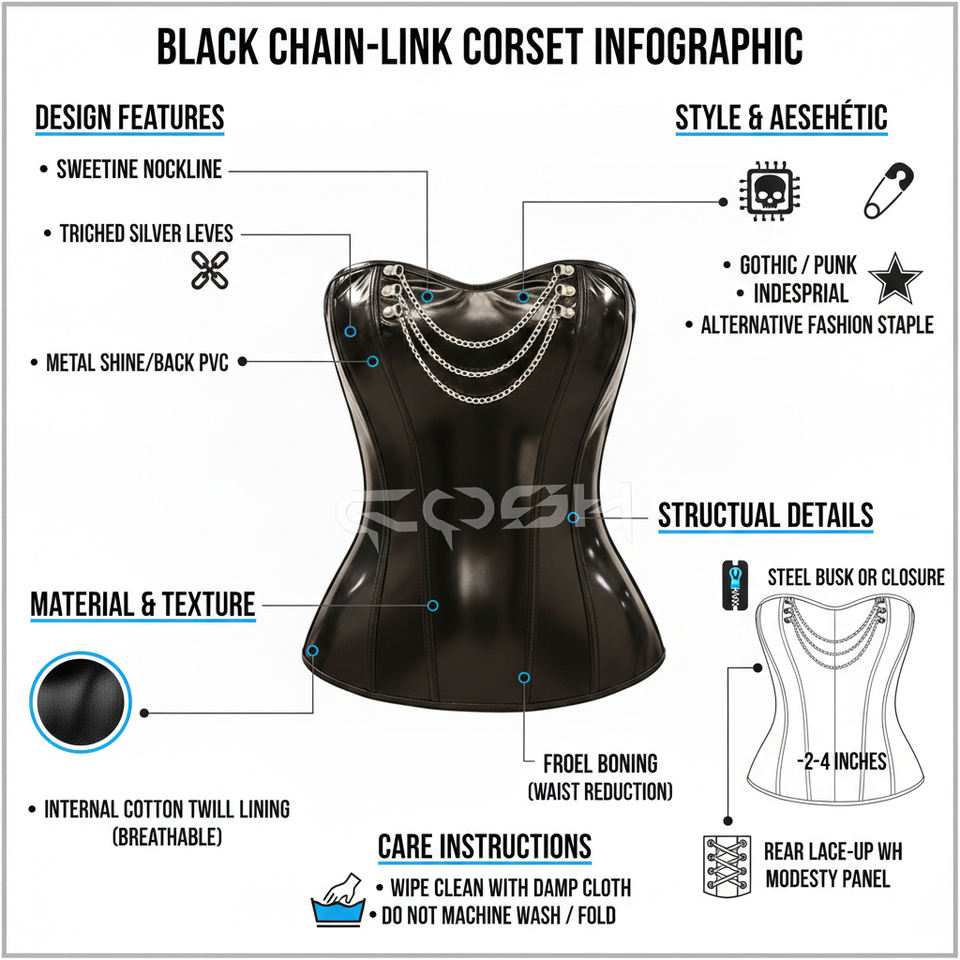 คอร์เซ็ทแบบรัดเอวสีดำเงา ผลิตตามสั่ง (OEM) ทำจากไวนิล PVC พร้อมโซ่สีเงินด้านหน้า – คอร์เซ็ทรัดเอวสำหรับผู้หญิงแบบทนทาน