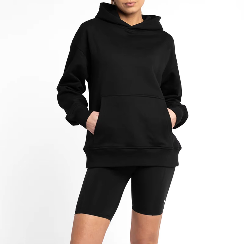 ชุดเสื้อมีฮู้ดทรงหลวมสำหรับสตรีผ้าฝ้าย100% มีโลโก้ด้านหน้า OEM แบบกำหนดเองสีดำขนาดพิเศษ