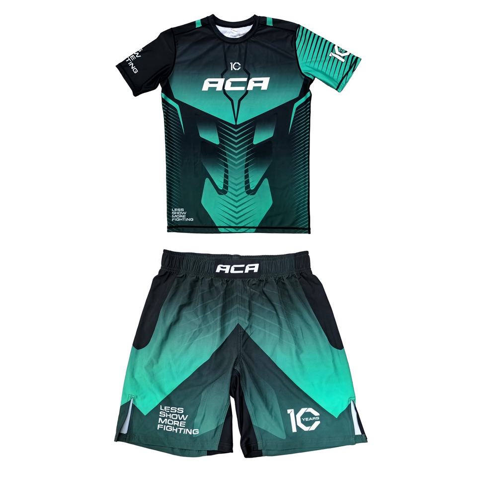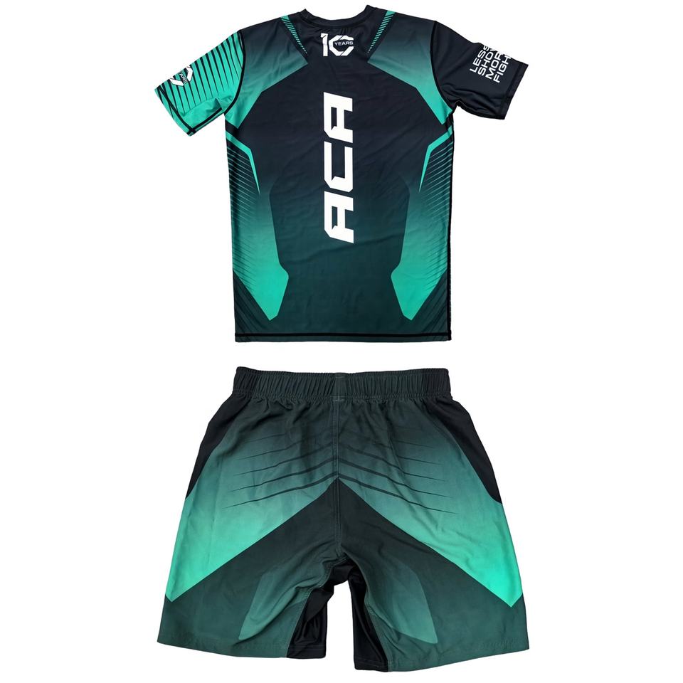 ชุดเสื้อผ้า MMA แบบ OEM ที่ออกแบบเอง เสื้อรัดกล้ามแขนสั้นพร้อมกางเกงขาสั้นเข้าชุดสำหรับ BJJ และศิลปะการต่อสู้แบบผสมผสาน