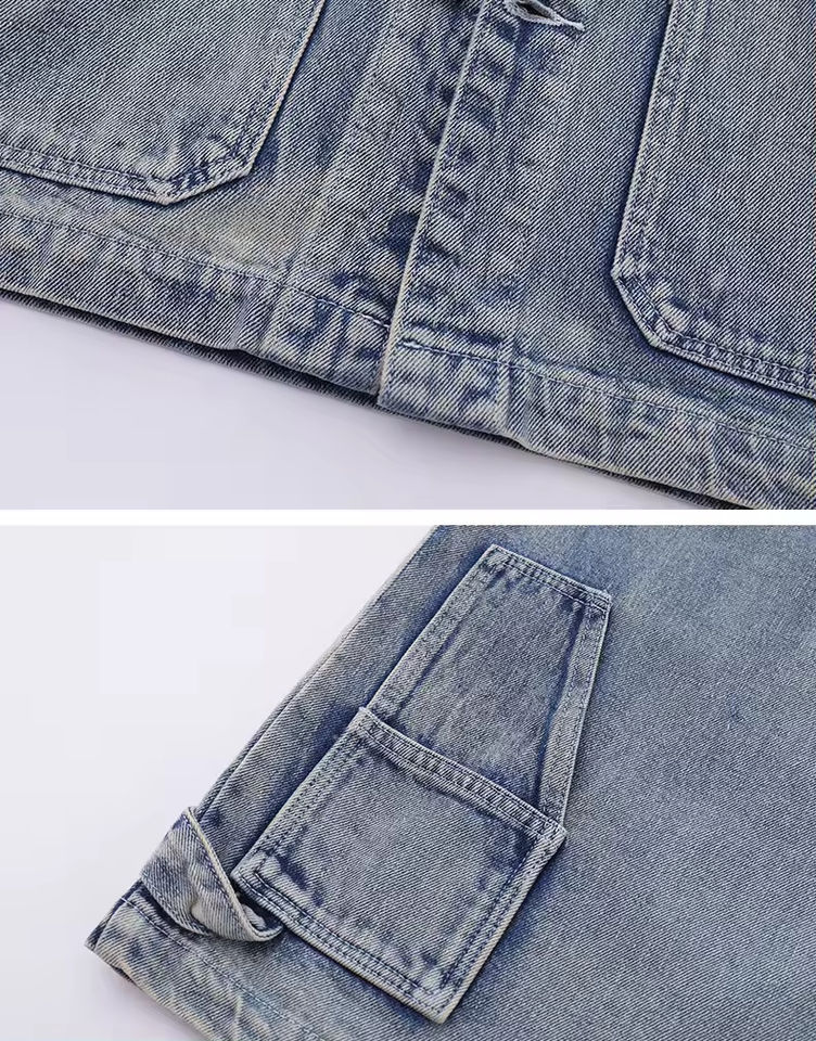แจ็กเก็ตผ้าเดนิมของผู้ชายเสื้อโค้ทผ้าฝ้ายสีเข้มจางลงมีกระดุมตกแต่งขนาดใหญ่ซักได้สำหรับทุกเพศ
