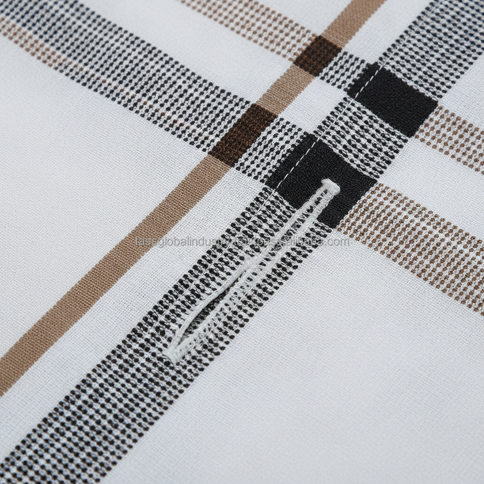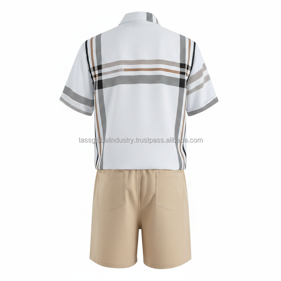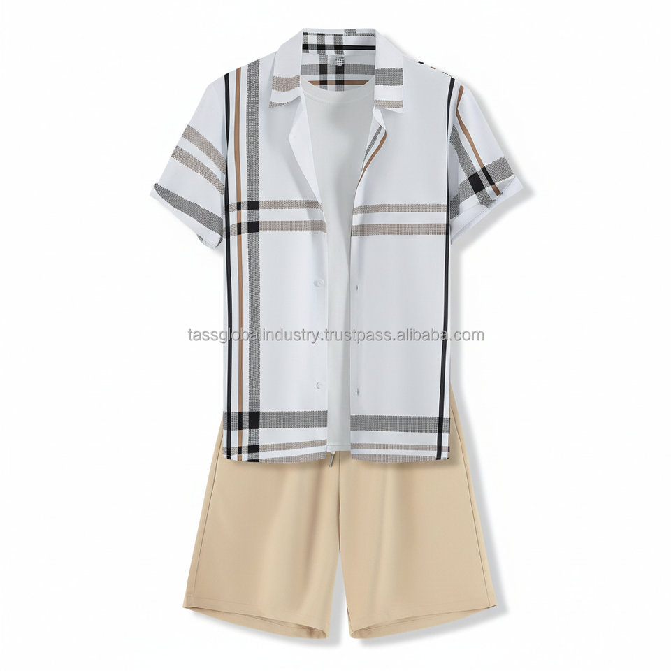 ชุดเสื้อเชิ้ตลายสก็อตผู้ชายแบบ OEM สั่งทำพิเศษ - เสื้อแขนสั้นลายตารางสีขาวและกางเกงขาสั้นสีเบจ ชุด 2 ชิ้น