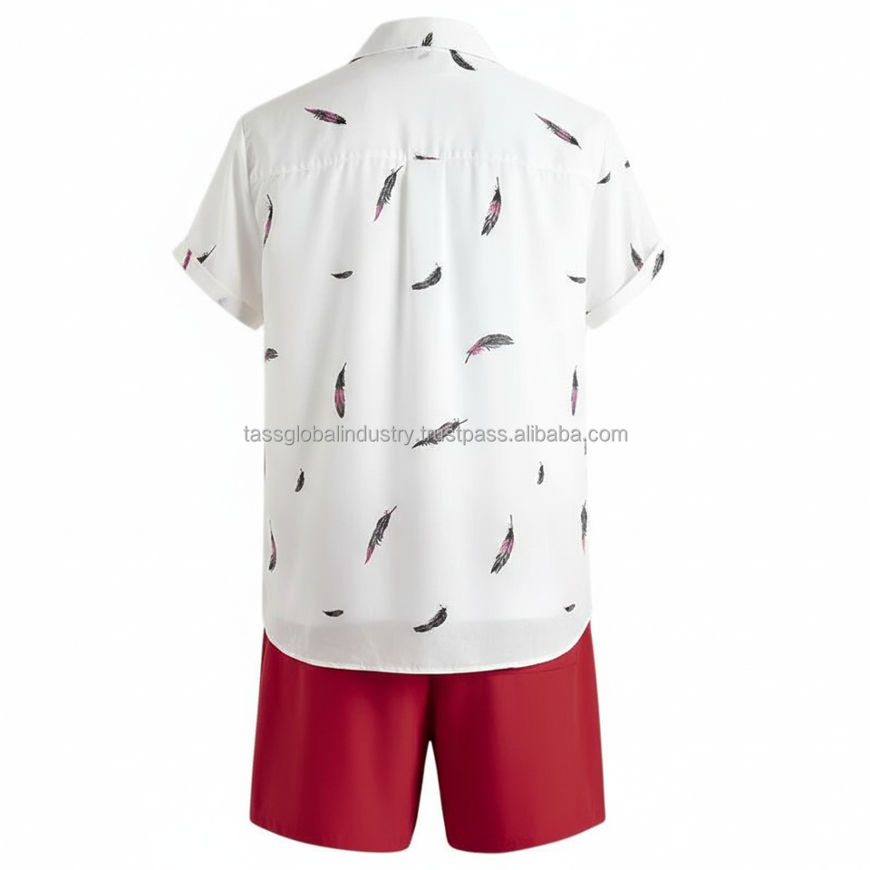 ชุดเซ็ตเสื้อยืดแขนสั้นลายขนนกสีขาวและกางเกงขาสั้นสีแดง 2 ชิ้น สำหรับผู้ชาย แบบสั่งทำพิเศษ (OEM) สำหรับฤดูร้อน