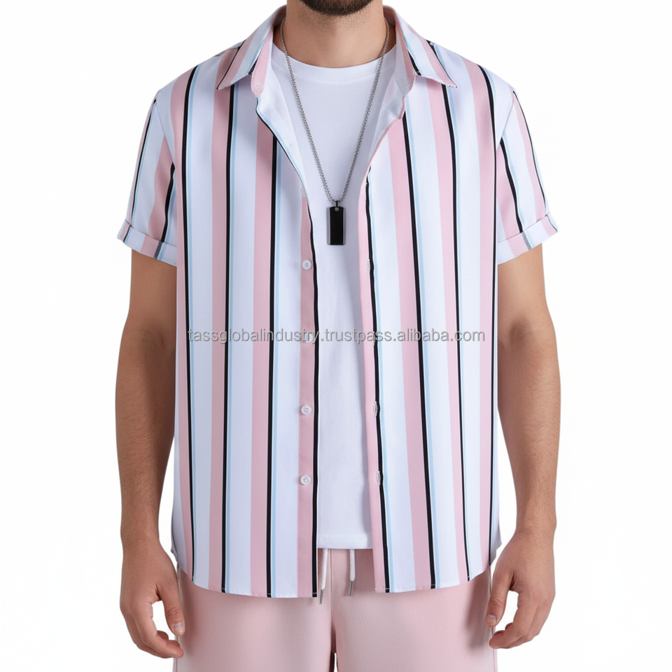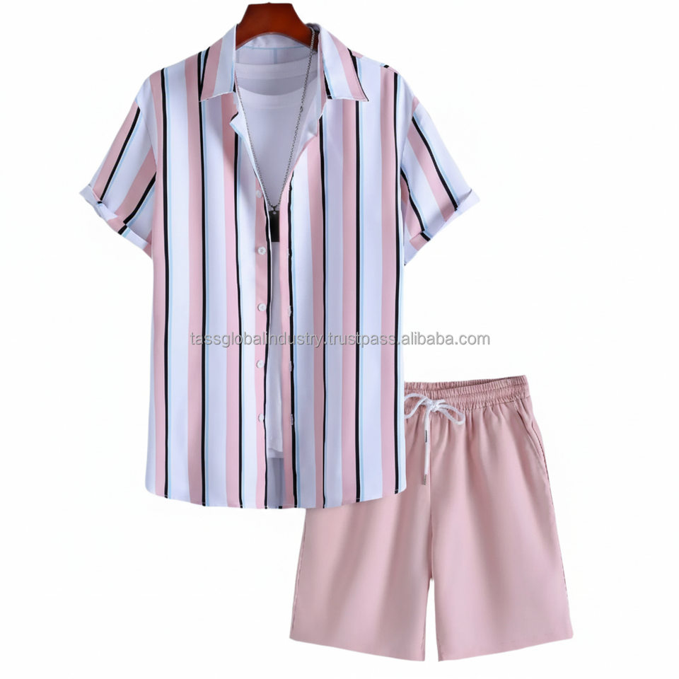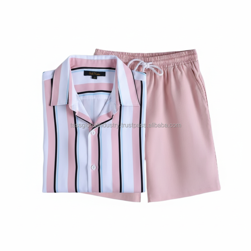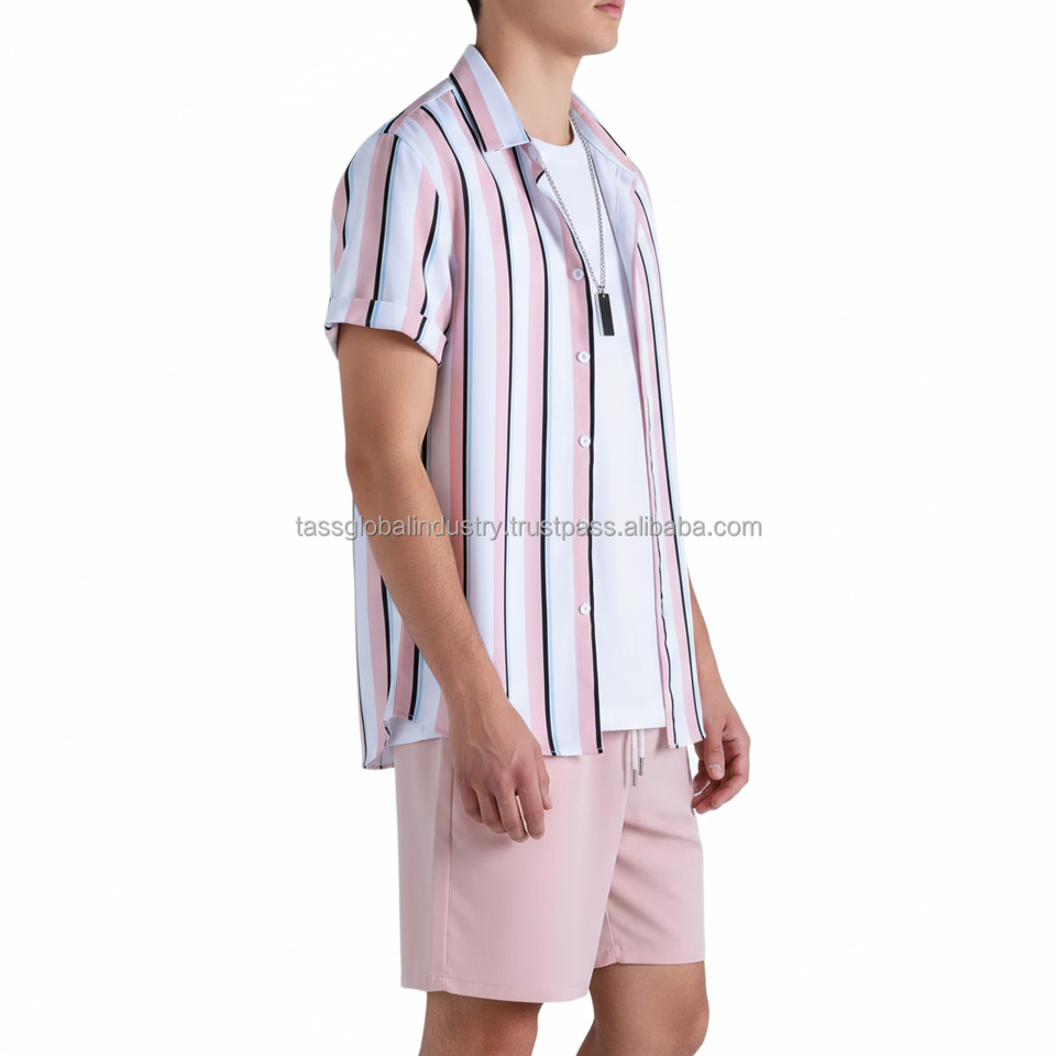 ชุดเสื้อเชิ้ตผู้ชายลายทางแบบกำหนดเอง OEM - ชุดลำลองฤดูร้อนแขนสั้นลายทางแนวตั้งสีชมพู