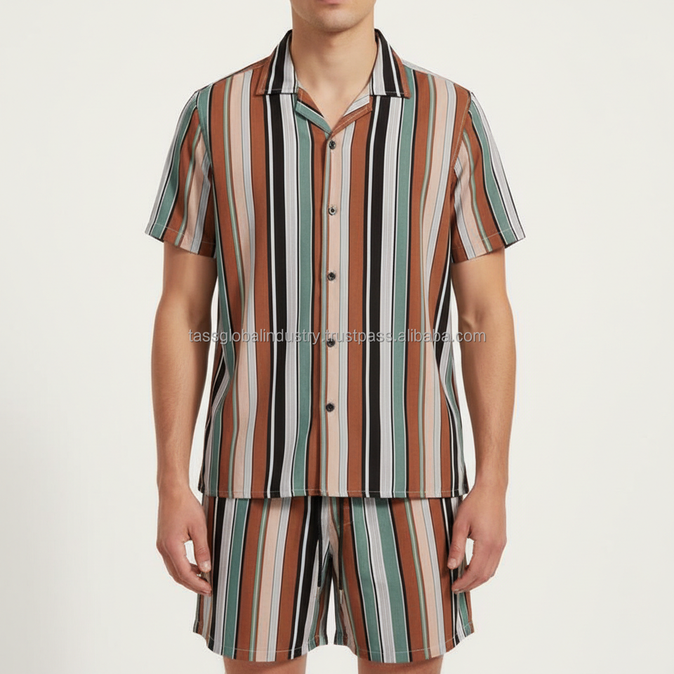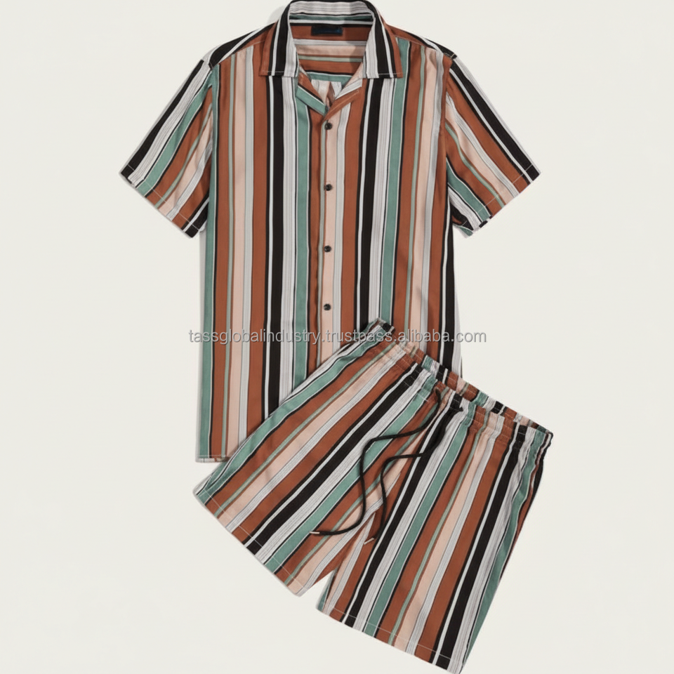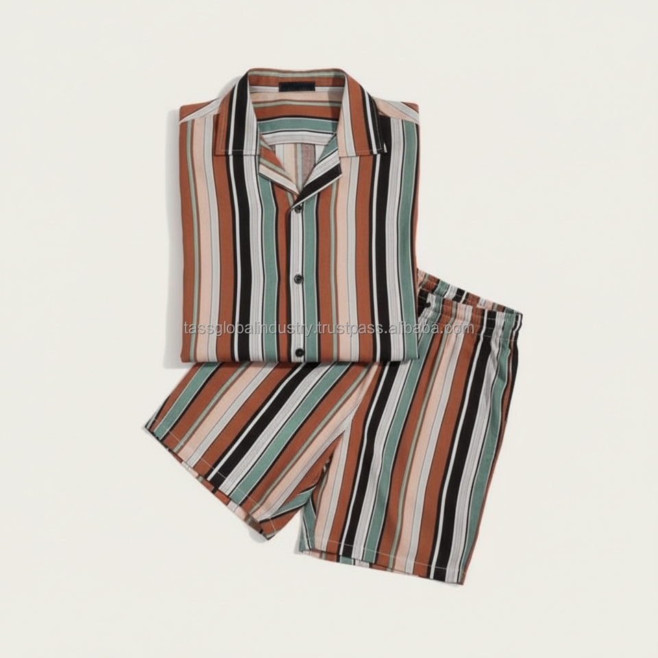 ชุดเซ็ตเสื้อผ้าผู้ชายลายทางแบบกำหนดเอง OEM - สีน้ำตาลและสีเขียวอมฟ้า ลายทางแนวตั้ง ชุดลำลองฤดูร้อน 2 ชิ้น