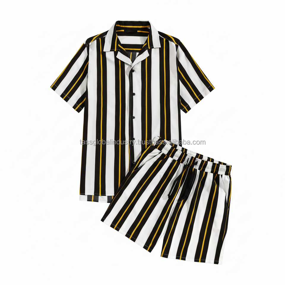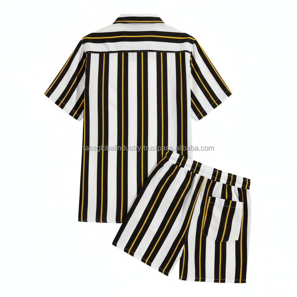 ชุดเซ็ตเสื้อผ้าผู้ชายลายทางสีดำ ขาว เหลือง แบบ OEM สั่งทำพิเศษ - ชุดฤดูร้อน 2 ชิ้น