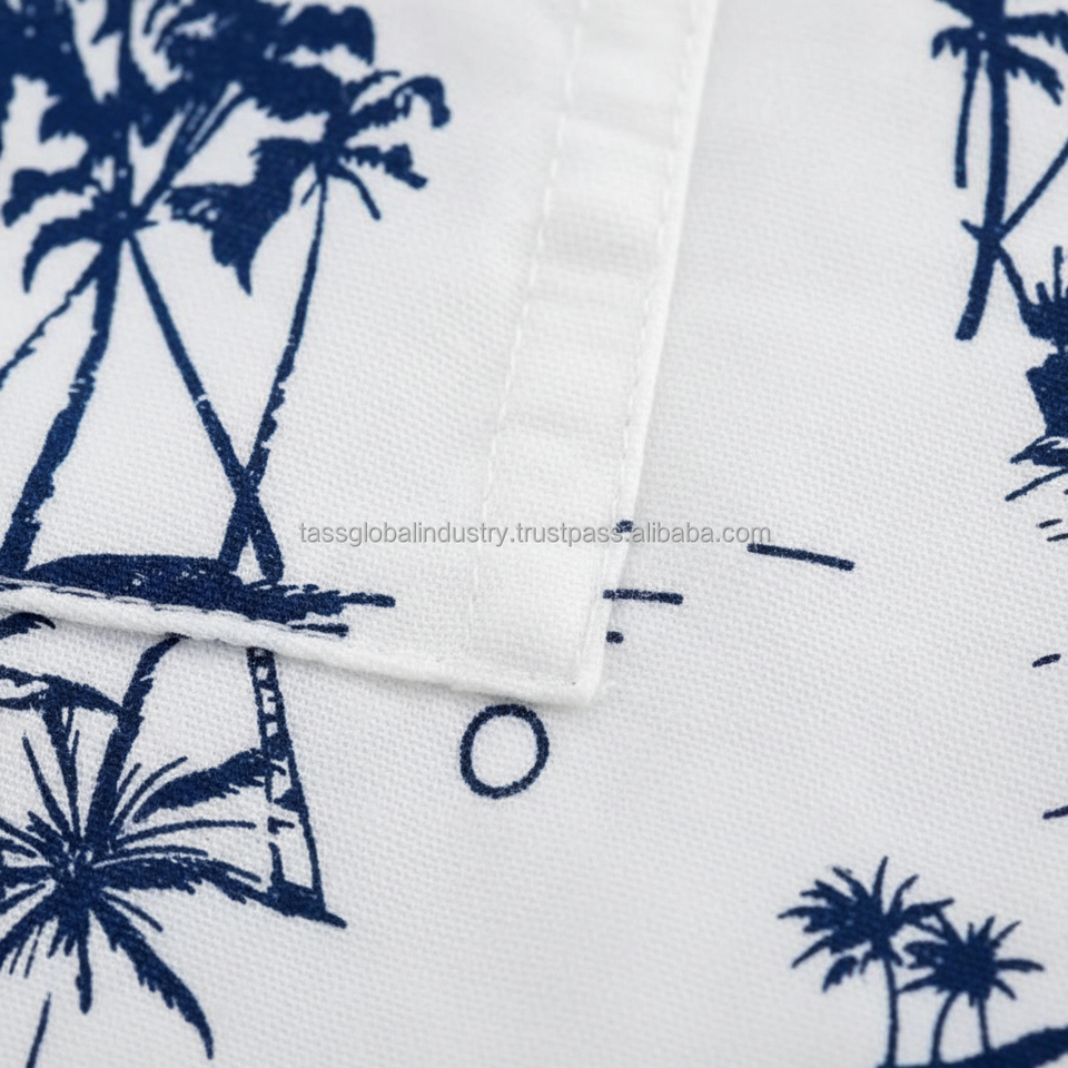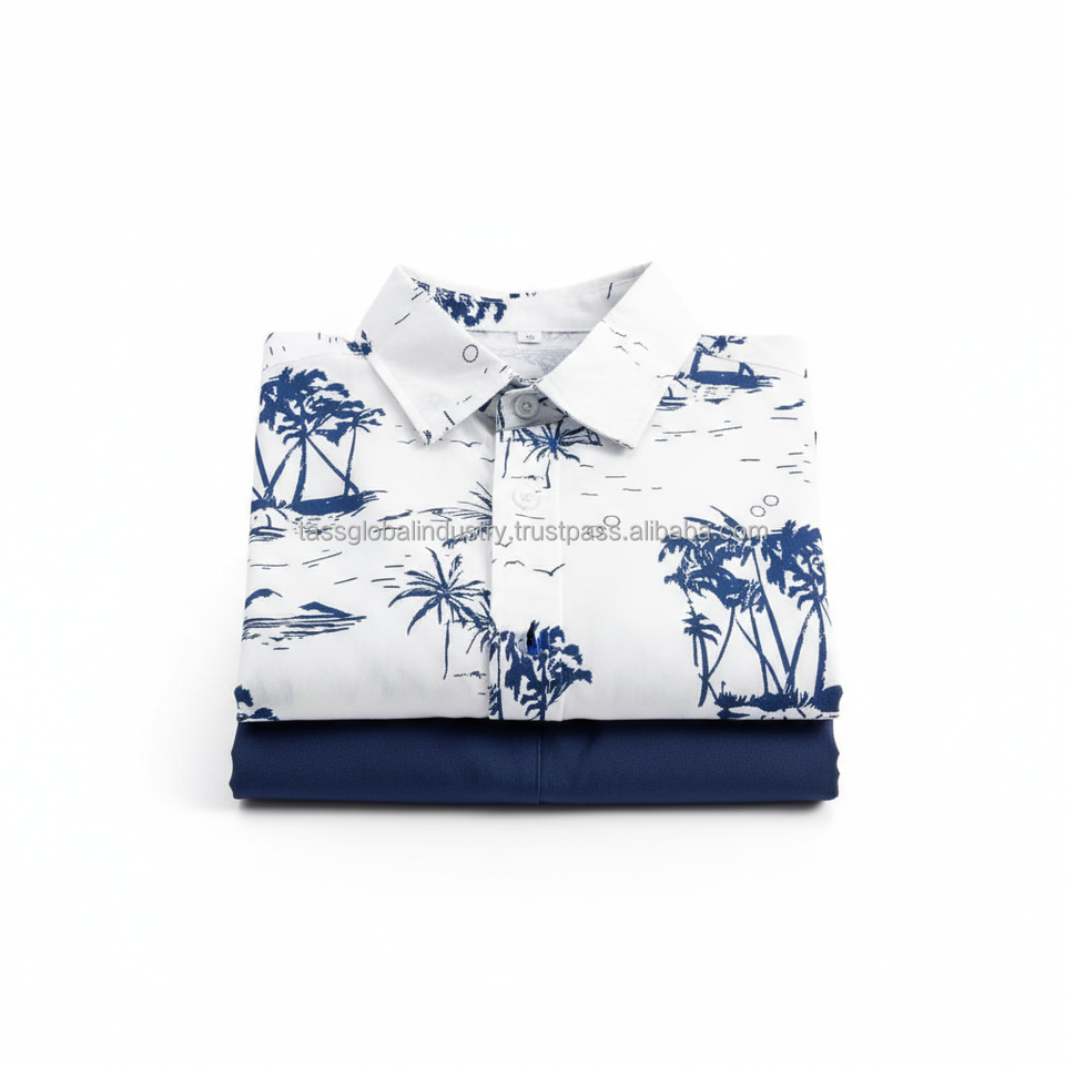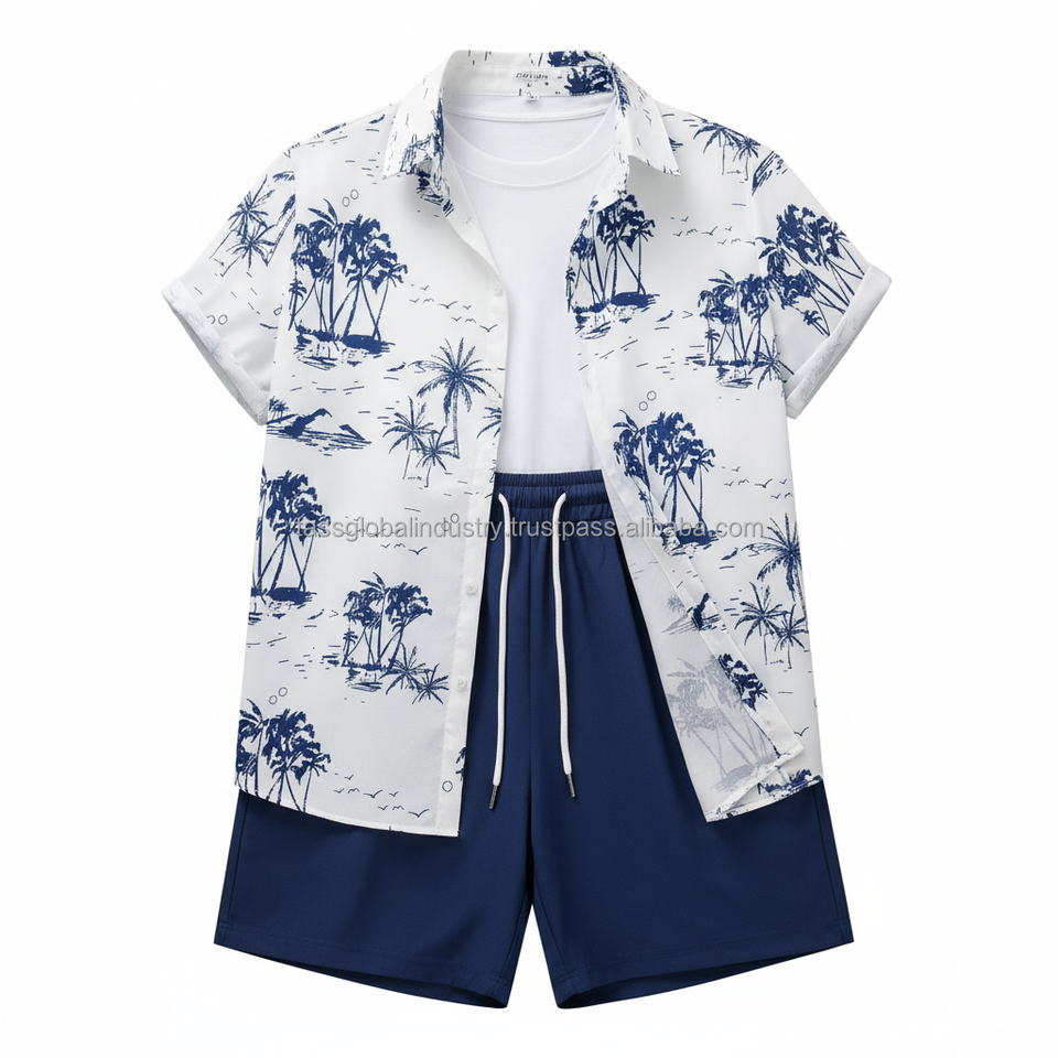 ชุดเซ็ตพิมพ์ลายทรอปิคอลสำหรับผู้ชายแบบ OEM - เสื้อแขนสั้นลายต้นปาล์มสีขาวและกางเกงขาสั้นสีน้ำเงิน ชุดฤดูร้อน 2 ชิ้น