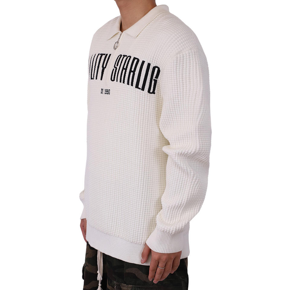 เสื้อโปโลแขนยาวสำหรับผู้ชายเสื้อถักปักลายตัวอักษรเสื้อถักแบบสวมหัวมีซิป