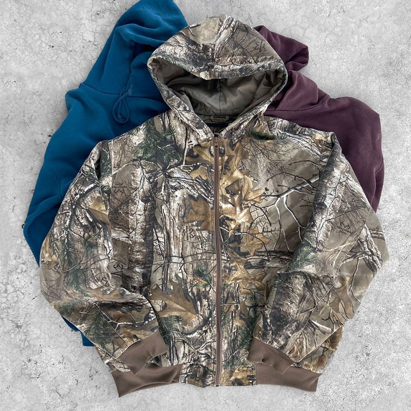 เสื้อมีฮู้ดลายใบเมเปิ้ลแบบรูดซิปสำหรับผู้ชายเสื้อมีฮู้ดลายใบเมเปิ้ลพิมพ์ซับลิเมชันแบบกำหนดเองพิมพ์ลายต้นไม้จริงลายพรางสำหรับผู้ชาย