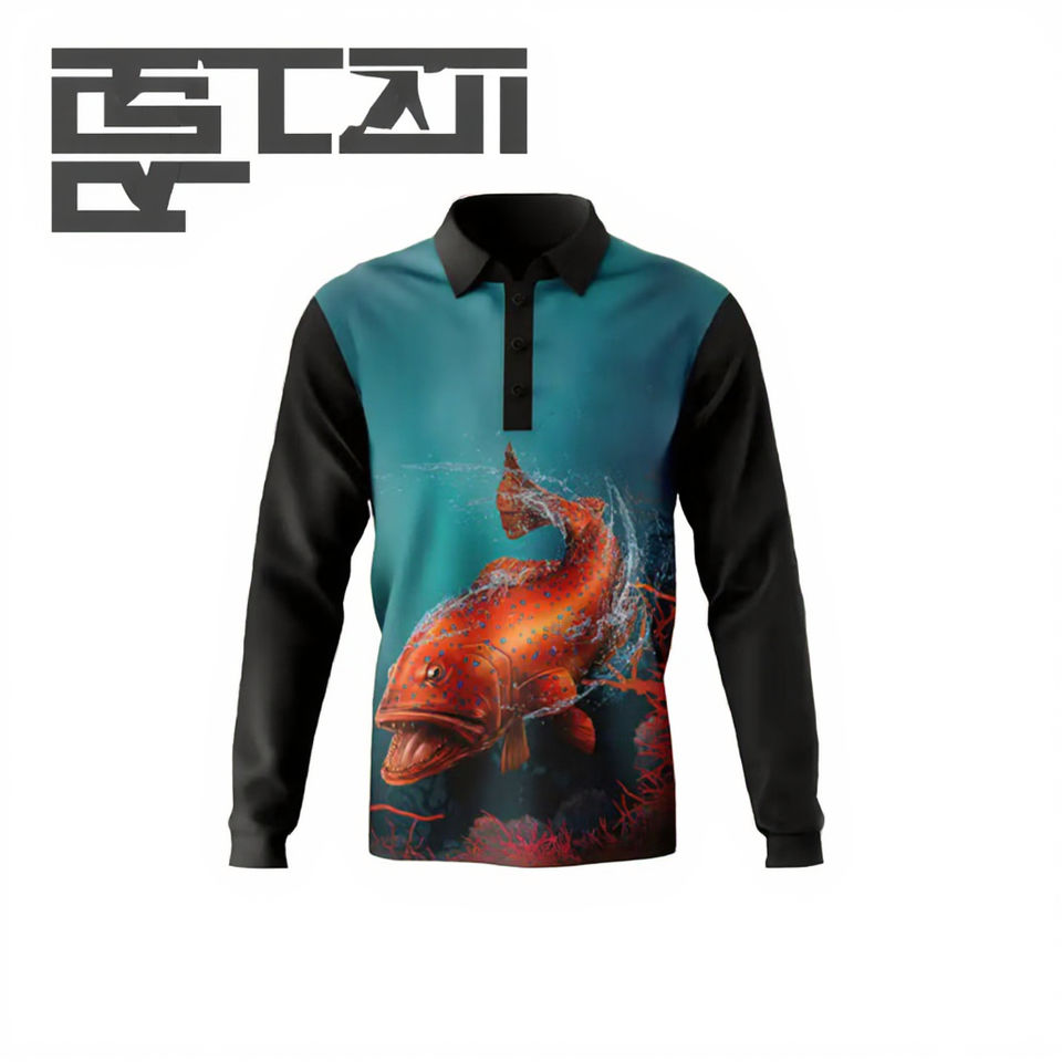 เสื้อโปโลตกปลาผู้ชายลายพิมพ์ซับลิเมชั่นลายมหาสมุทร ผ้าโพลีเอสเตอร์ 100% แห้งเร็ว น้ำหนักเบา 180 กรัม ติดกระดุม ชุดตกปลา