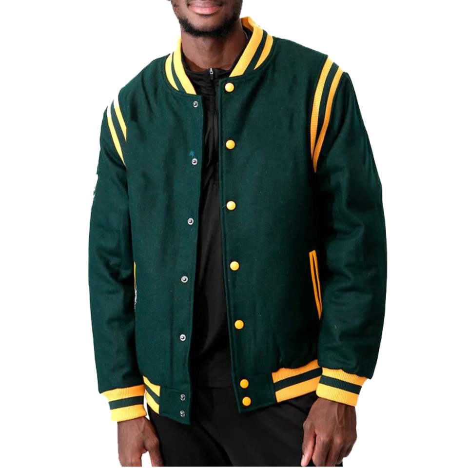 แจ็คเก็ตนักเรียนแบบกำหนดเองผ้าขนสัตว์สีเขียวตัวอักษรกับแพทช์กำมะหยี่ที่กำหนดเองและปักสำหรับทุกเพศ