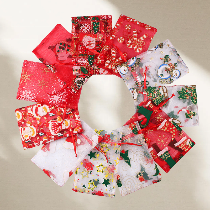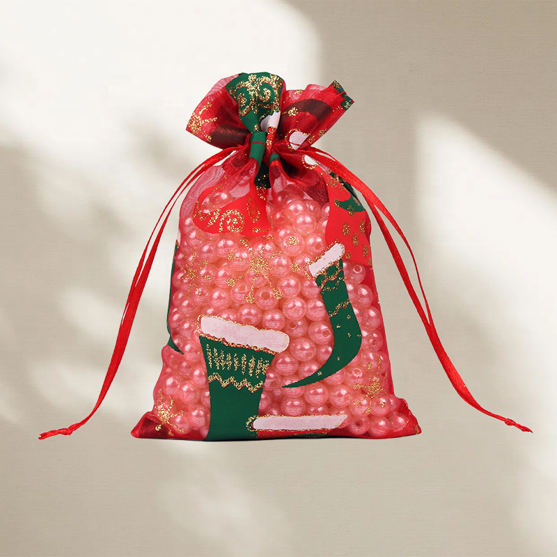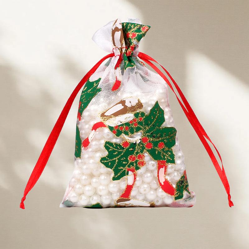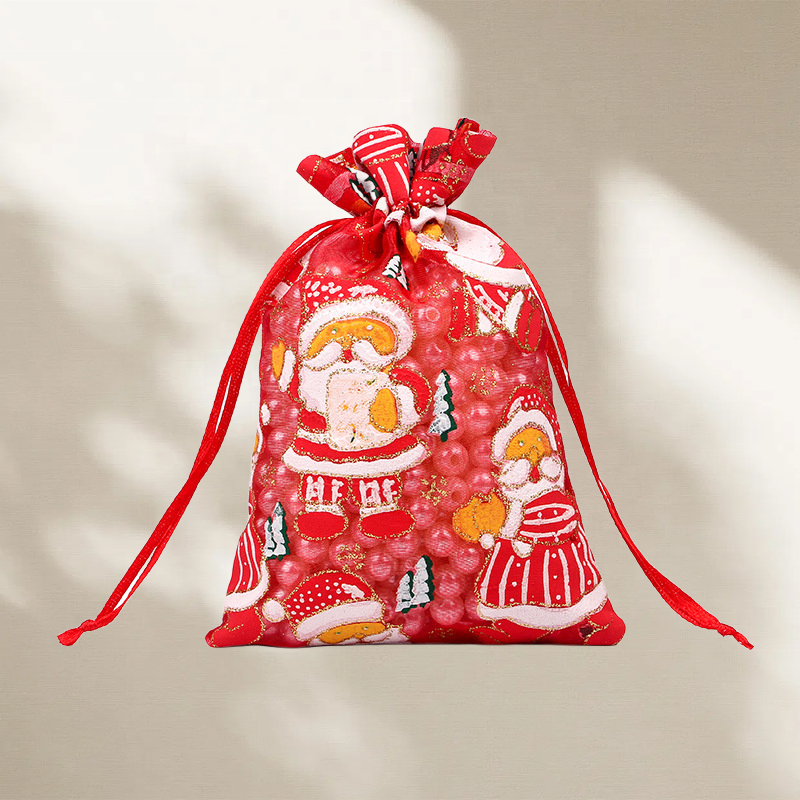 ถุงผ้าโปร่งบางแบบกำหนดขนาดเองถุงหูรูดคริสต์มาสสีสโนว์แมนที่กำหนดเองพิมพ์ลายสกรีน