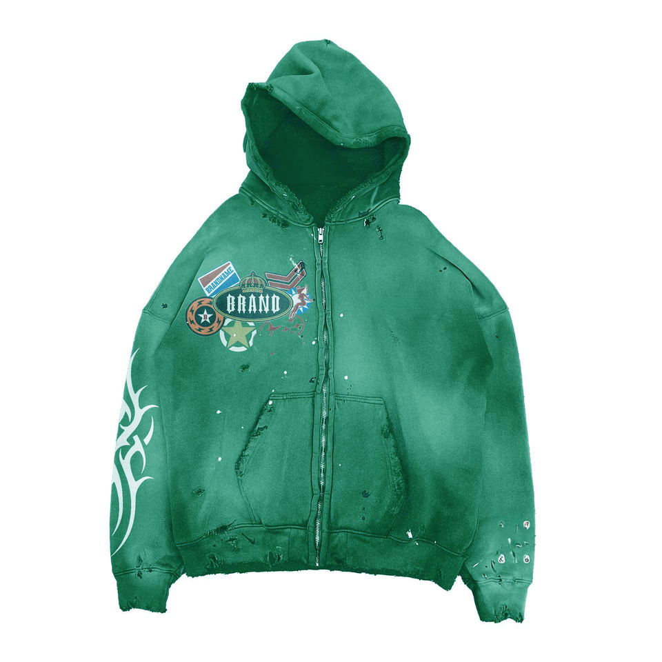 เสื้อฮู้ดดี้โอเวอร์ไซส์สั่งทำพิเศษ ขายส่ง แบบซันเฟด ดีไซน์ขาดๆ แขนยาว มีฮู้ด แต่งคริสตัล แฟชั่นสำหรับผู้ชาย ล้างสีแบบแอซิดวอช