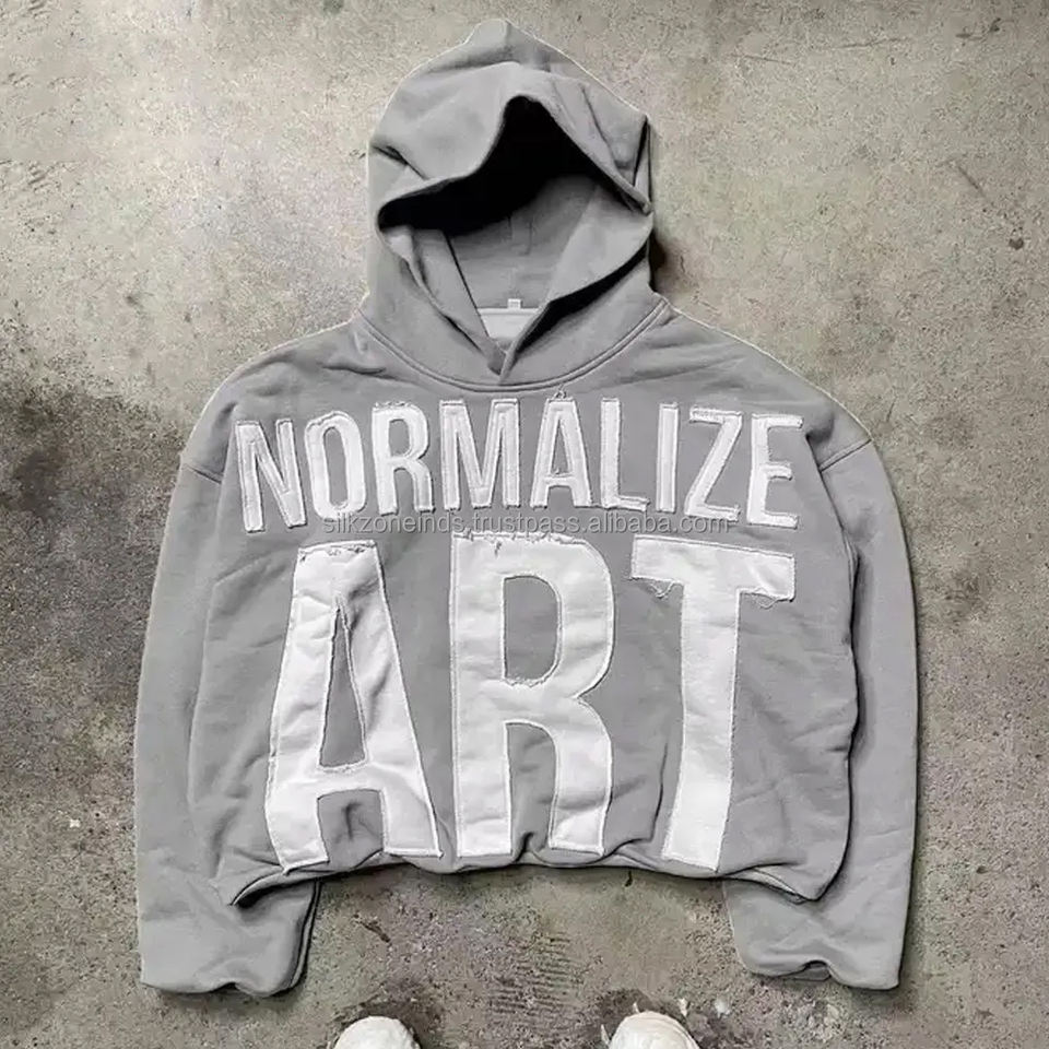 เสื้อฮู้ดดี้ผู้ชายผ้าฟลีซคอตตอน 100% ระบายอากาศได้ดี ทรงโอเวอร์ไซส์ พิมพ์ลายพัฟฟ์หนา ปักลายแบบดิสเทรส ไซส์พลัส