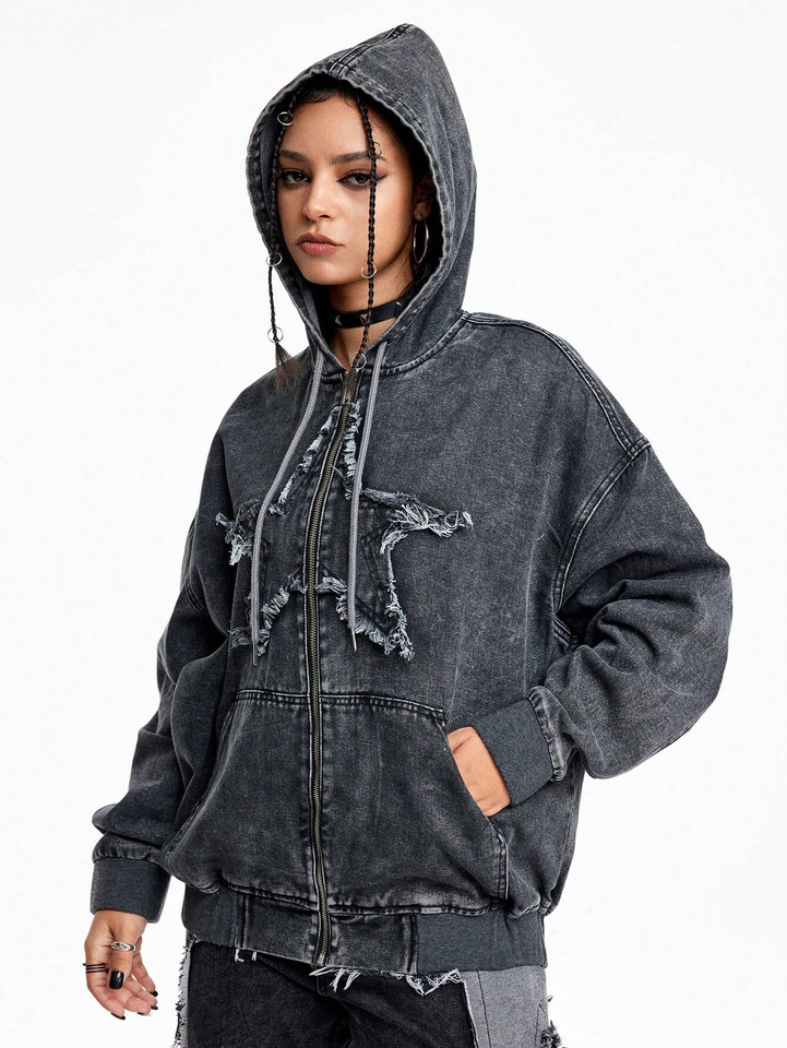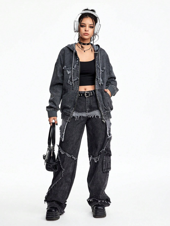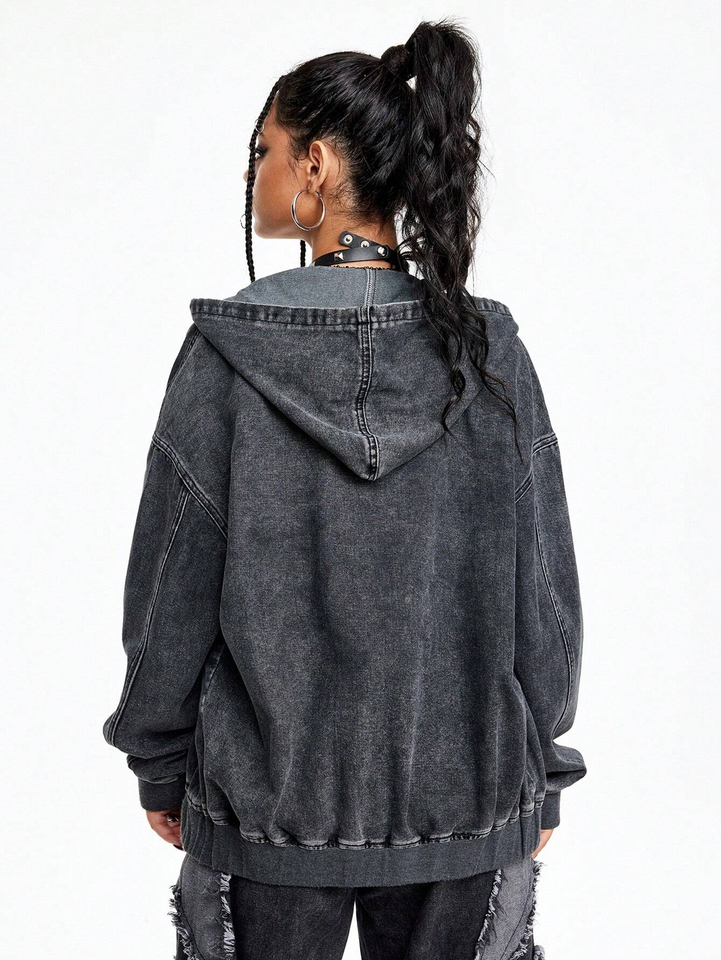 เสื้อสเวตเชิ้ตโอเวอร์ไซส์แบบมีฮู้ด ซิปหน้า ผ้าฟลีซบุขนด้านใน ทรงดิสเทรส ล้างสีแบบแอซิดวอช พร้อมกางเกงเดนิมเข้าชุด สำหรับผู้ชาย เป็นมิตรต่อสิ่งแวดล้อม
