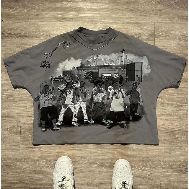 เสื้อยืดพิมพ์ลายอะนิเมะแอซิดสำหรับผู้ชายเสื้อยืดผ้าฝ้ายพิมพ์ลายกราฟิกทรงหยดน้ำขนาดใหญ่โอเวอร์ไซส์แบบกำหนดเอง