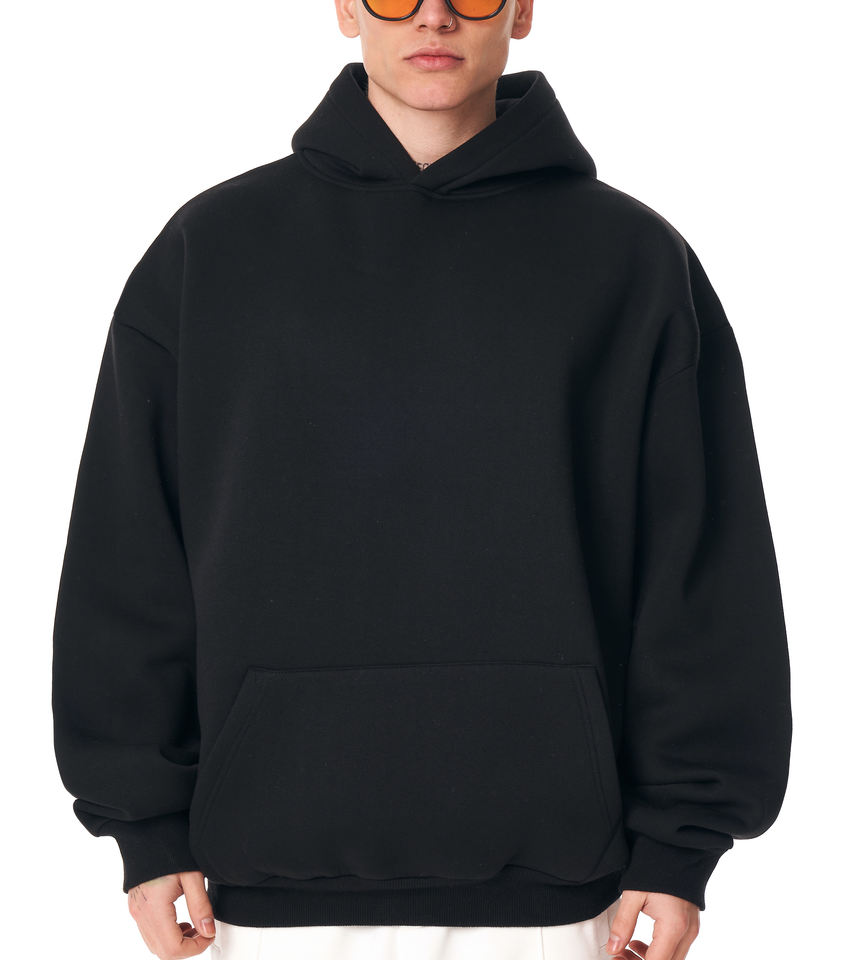 เสื้อสเวตเตอร์มีฮู้ดสีดำพรีเมียมของผู้ชายผ้าคอตตอนหนาโอเวอร์ไซส์กำหนดเองได้เทรนด์2024มีคุณสมบัติ