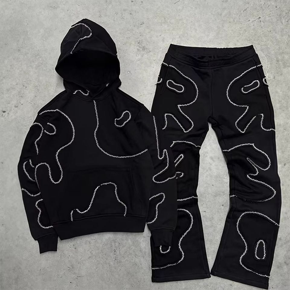 ชุดวอร์มโอเวอร์ไซส์ประดับเพชรเทียม สไตล์แบ็กกี้ ล้างสีแบบแอซิดวอช ชุดเซ็ตเสื้อฮู้ดซิปและกางเกงวอร์มสำหรับผู้ชาย