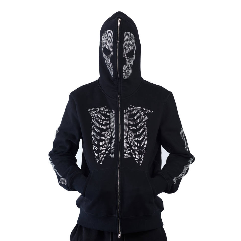 เสื้อมีฮู้ดพิมพ์โลโก้ตามสั่งสำหรับฤดูหนาวแบบมีซิปรูดทรงโครงกระดูกประดับพลอยเทียมแบบเต็มหน้าพิมพ์โลโก้ได้ตามต้องการ