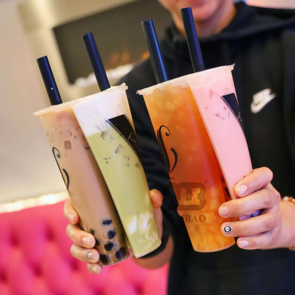 แก้วพลาสติกแบบใช้แล้วทิ้งสองช่องสำหรับเครื่องดื่มเย็น เช่น ชานมไข่มุก ชาเขียวมัทฉะ พร้อมฝาปิด