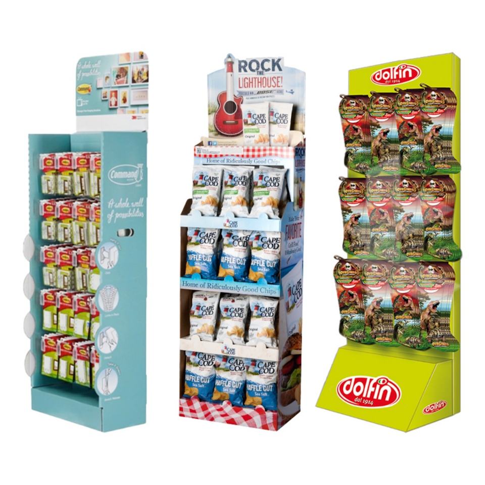 ชั้นวางสินค้าแบบตั้งพื้นสำหรับร้านค้าปลีก ทำจากกระดาษลูกฟูก สำหรับโชว์ขนมและอาหารในซูเปอร์มาร์เก็ต