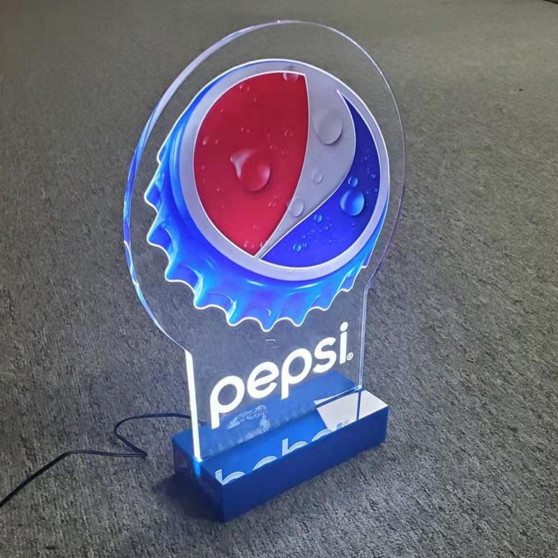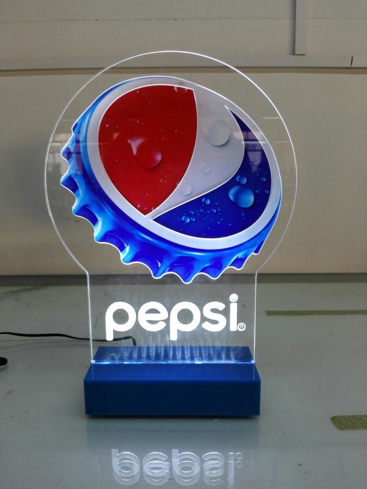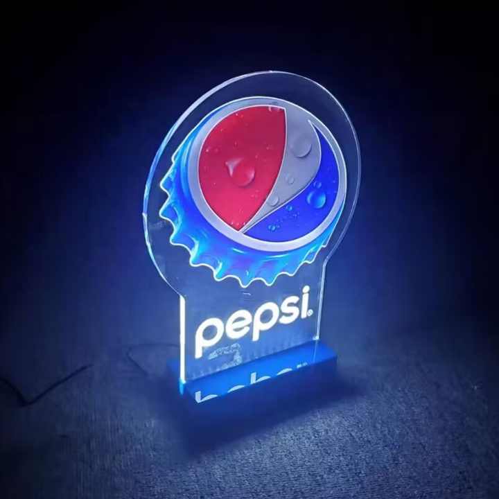 โลโก้ไฟ LED ตารางอะคริลิค POSM แบบกําหนดเองของเป๊ปซี่ส่องสว่างจอแสดงผลป้าย POP