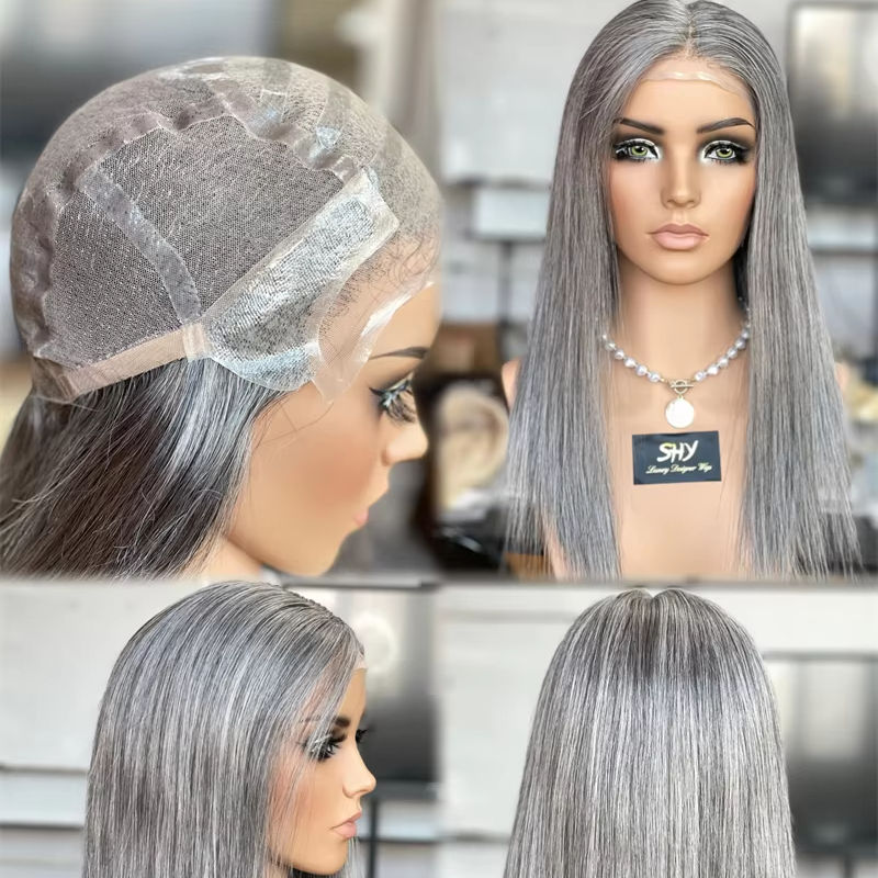 วิกผมทางการแพทย์แบบไม่มีกาวสีเทาสำหรับผู้หญิงวิกผมลูกไม้เต็มงานเย็บปะ PU แบบกำหนดเอง