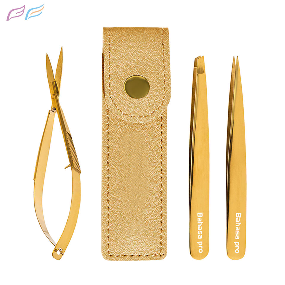 แหนบถอนขนทรงเฉียงสีทอง สำหรับใช้ในงานเสริมสวย พร้อมซอง PU รับทำโลโก้ส่วนตัว แหนบสีทอง