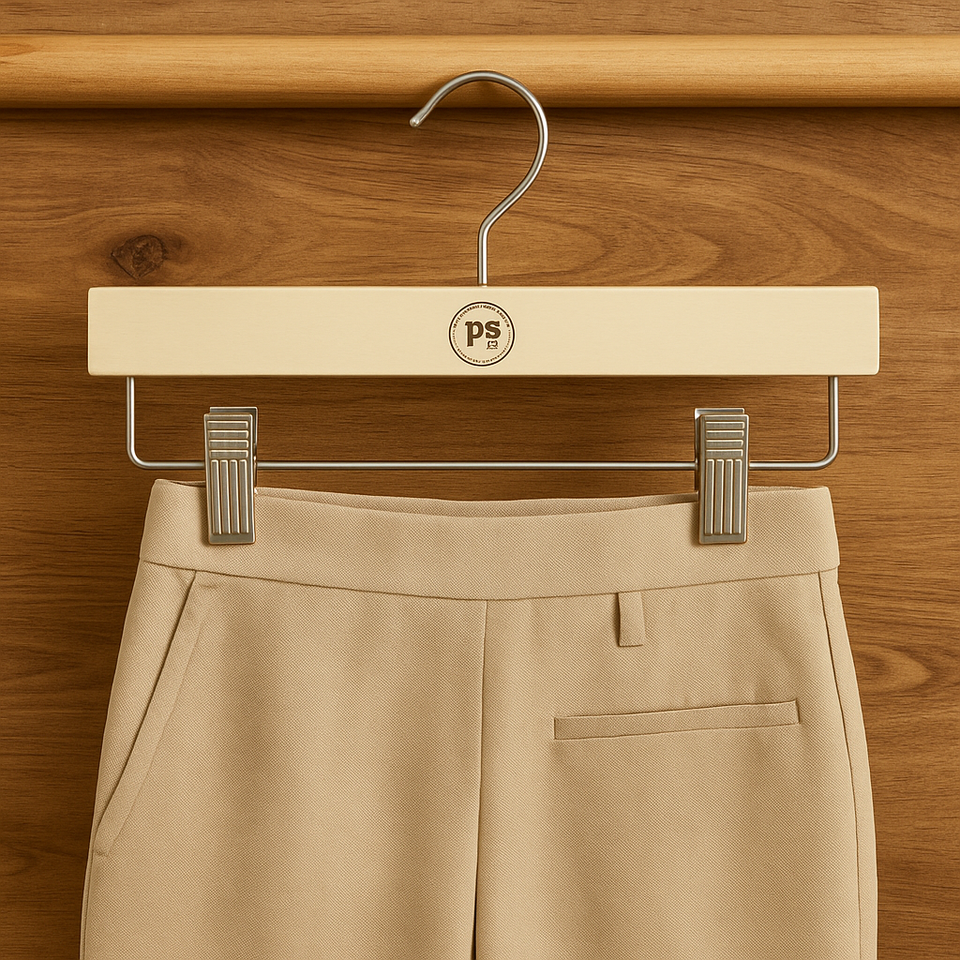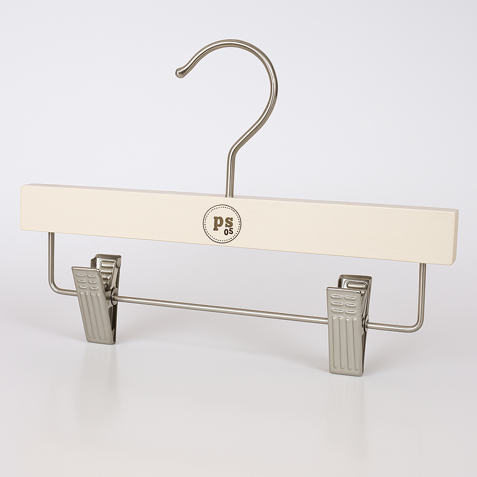 ที่แขวนกางเกงทำจากไม้ทาสีตามสั่งพร้อมโลโก้พิมพ์ลายที่แขวนแบบพรีเมียมสำหรับใช้แสดงในโรงแรมขายปลีกและเครื่องแต่งกาย
