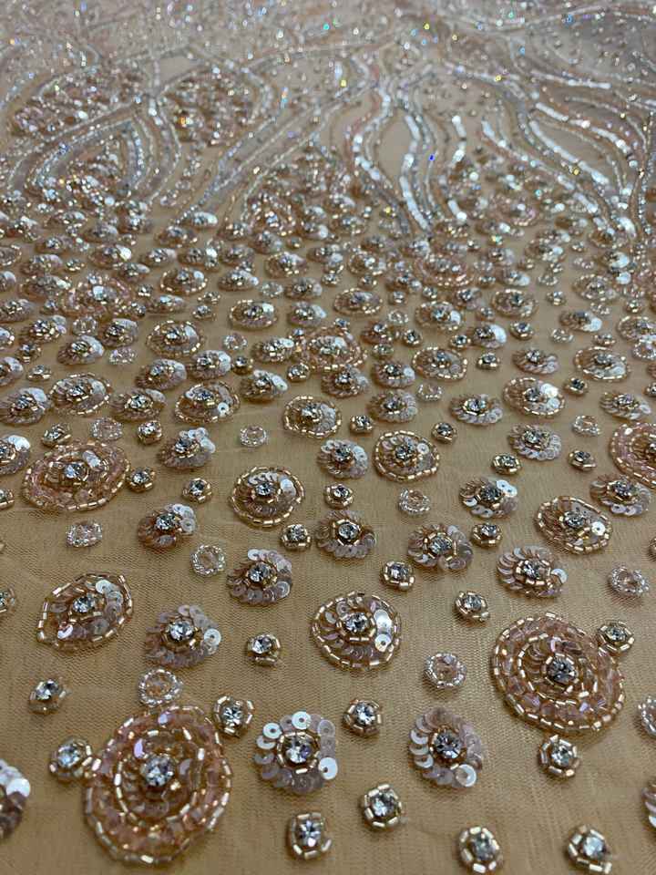 ผ้าลูกไม้ตาข่ายลายปักแบบสั่งทำพิเศษ คุณภาพสูง งานแฮนด์เมด 100% ประดับด้วยคริสตัลและลูกปัด เหมาะสำหรับงานออกแบบแฟชั่นบนรันเวย์และชุดราตรี