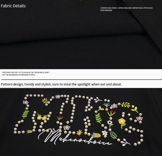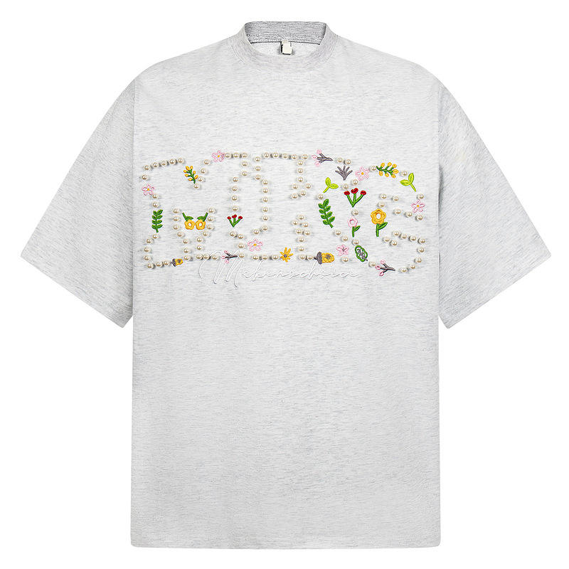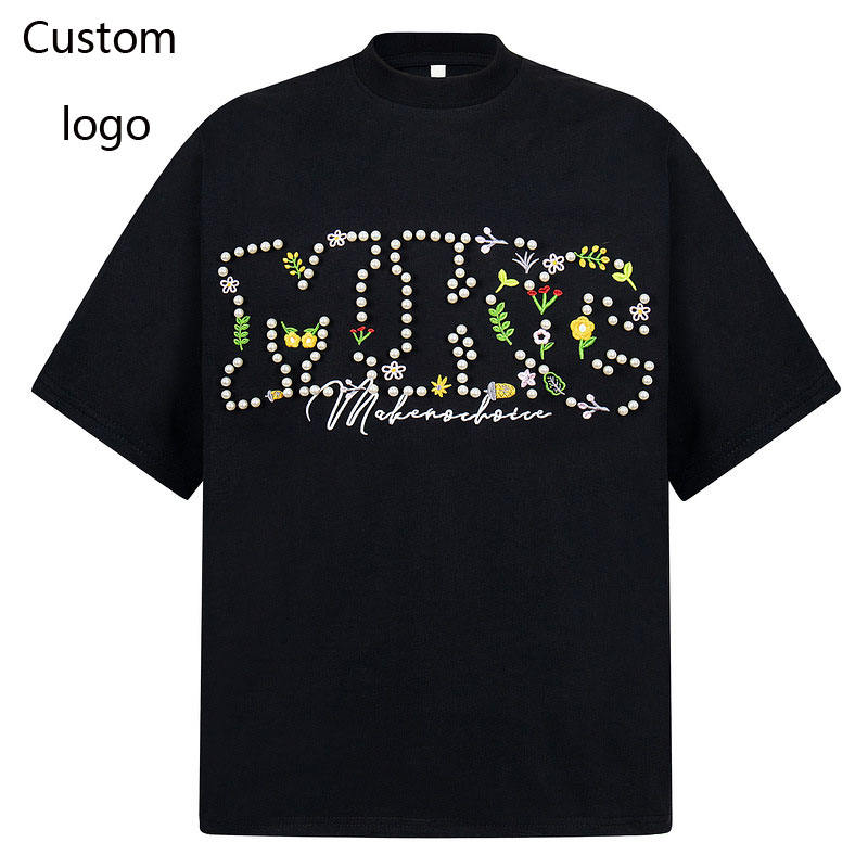 เสื้อยืดปักลายดอกไม้ไข่มุกแบบกำหนดเอง - สไตล์ยุโรป-อเมริกัน ทรงหลวม คอกลม แขนสั้น สำหรับผู้ชายและผู้หญิง