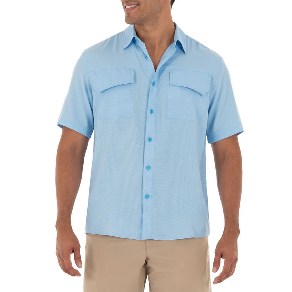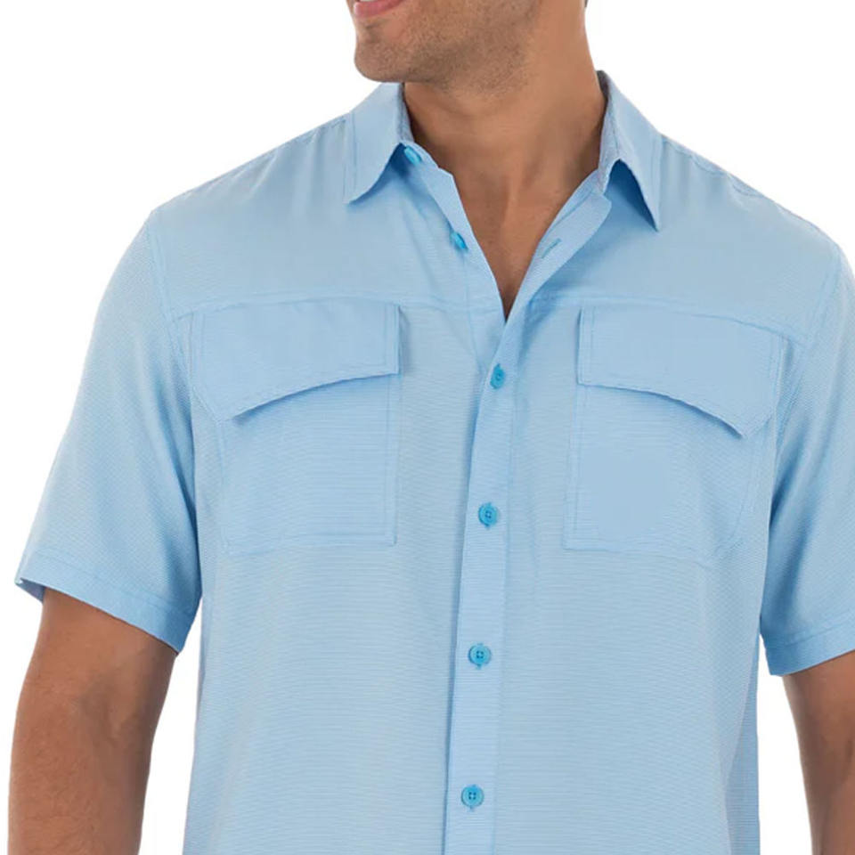 เสื้อตกปลาสำหรับกิจกรรมกลางแจ้ง ป้องกันแสงแดด UPF 50 ผลิตจากโพลีเอสเตอร์ 100% โลโก้ด้านหน้า แขนสั้น ติดกระดุม ผู้ชาย กันลม