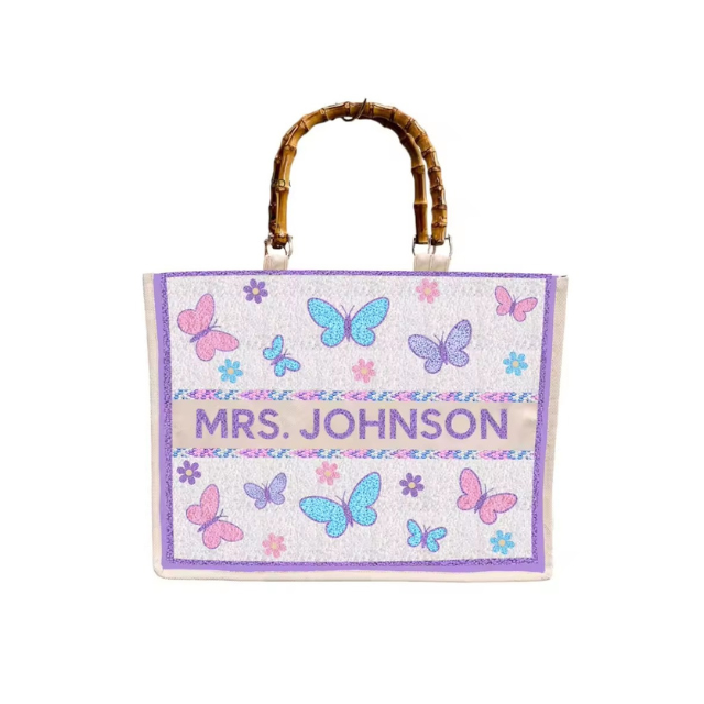 กระเป๋าผ้าแคนวาสปักลายลูกปัดสั่งทำพิเศษ ปักชื่อ งานแฮนด์เมด หูหิ้วไม้ ใส่เครื่องสำอาง ดีไซน์เฉพาะตัว ขนาดใหญ่