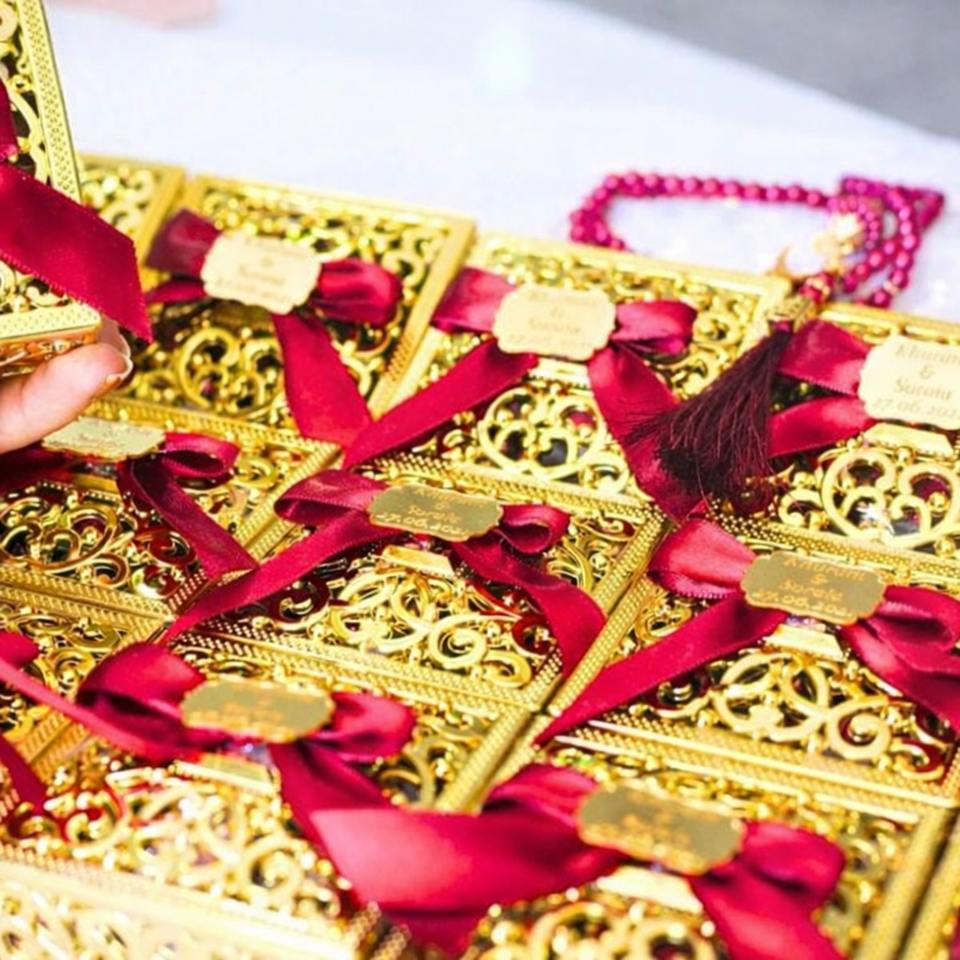 คัมภีร์อัลกุรอานกำมะหยี่, ลูกประคำมุก, กล่องของขวัญสีทองวัสดุ