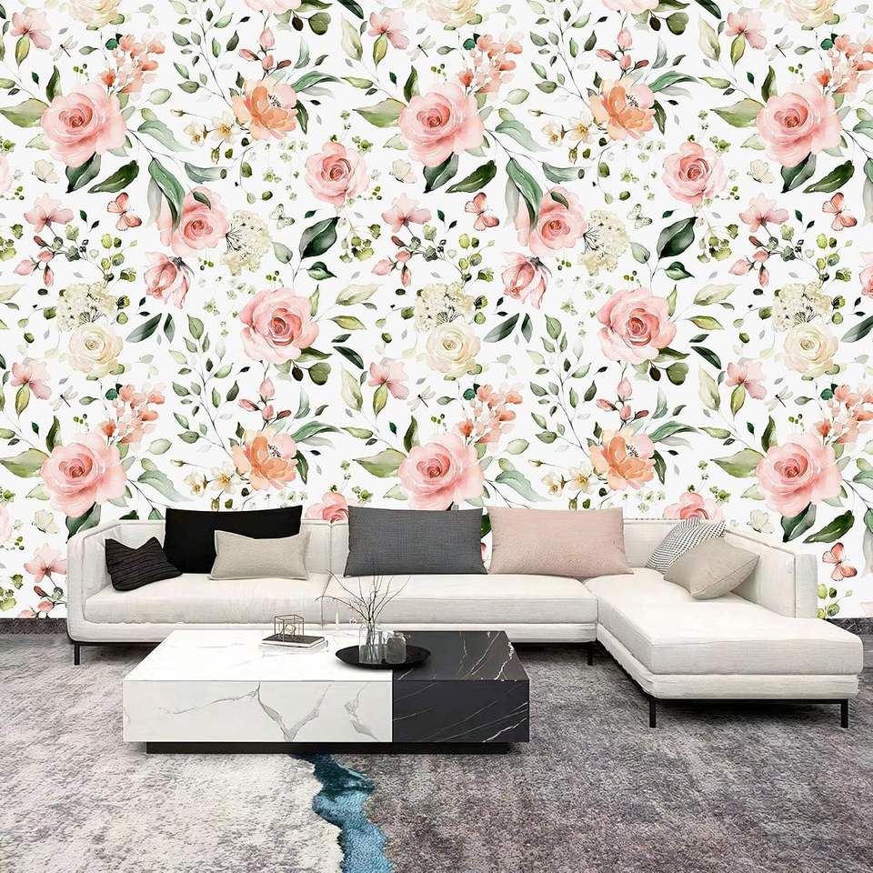 วอลเปเปอร์ภาพพิมพ์ลายดอกไม้สีชมพูแบบสั่งทำ ลายใบไม้ ผีเสื้อ ผ้าไหม สำหรับตกแต่งบ้านและสำนักงาน ผลิตในจีน