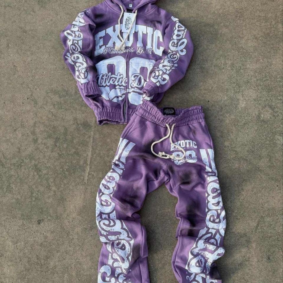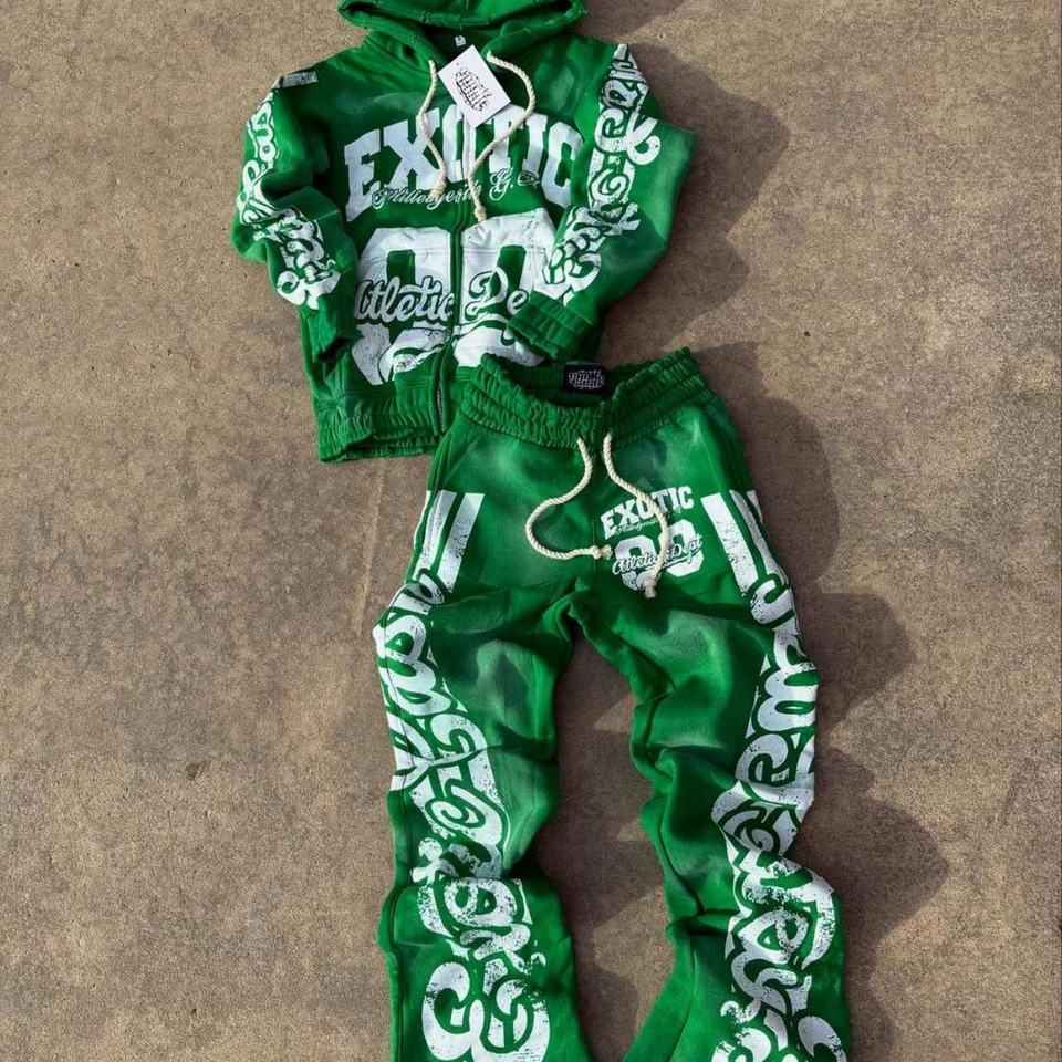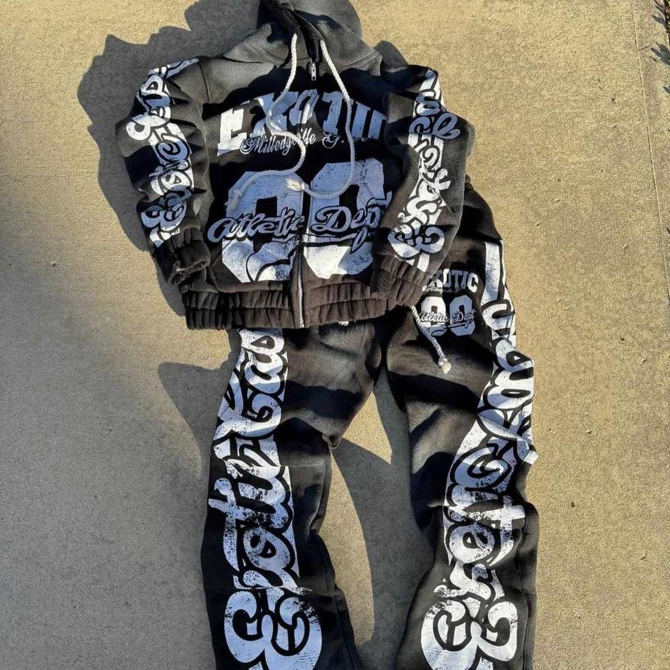 ชุดกีฬาผู้ชายแบบซิปสั่งทำพิเศษ ผงสำหรับพิมพ์ลายพัฟฟ์ ผ้าเทอร์รี่ เสื้อฮู้ด กางเกงวอร์ม กันลม สไตล์ฮิปฮอป สำหรับฤดูหนาว