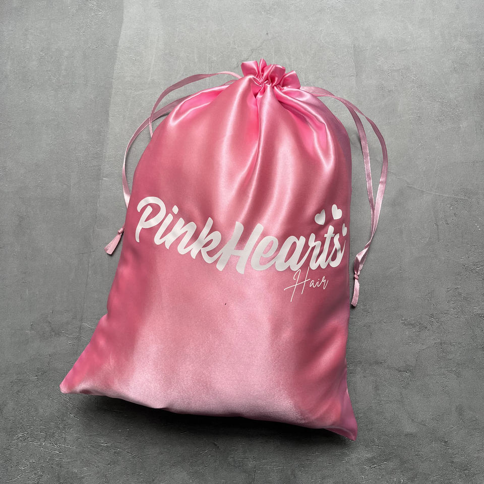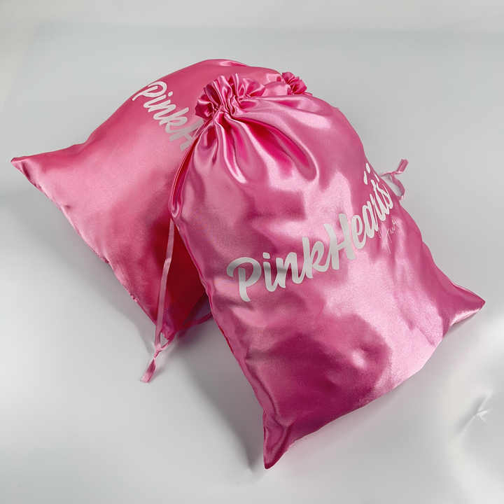 ถุงผ้าซาตินสีชมพูแบบมีเชือกผูกพร้อมพิมพ์สีขาว - บรรจุภัณฑ์หรูหราสำหรับแบรนด์ความงามและแฟชั่น