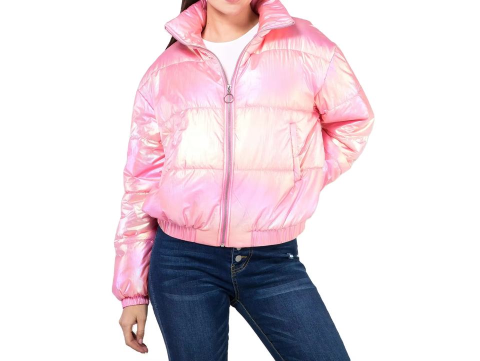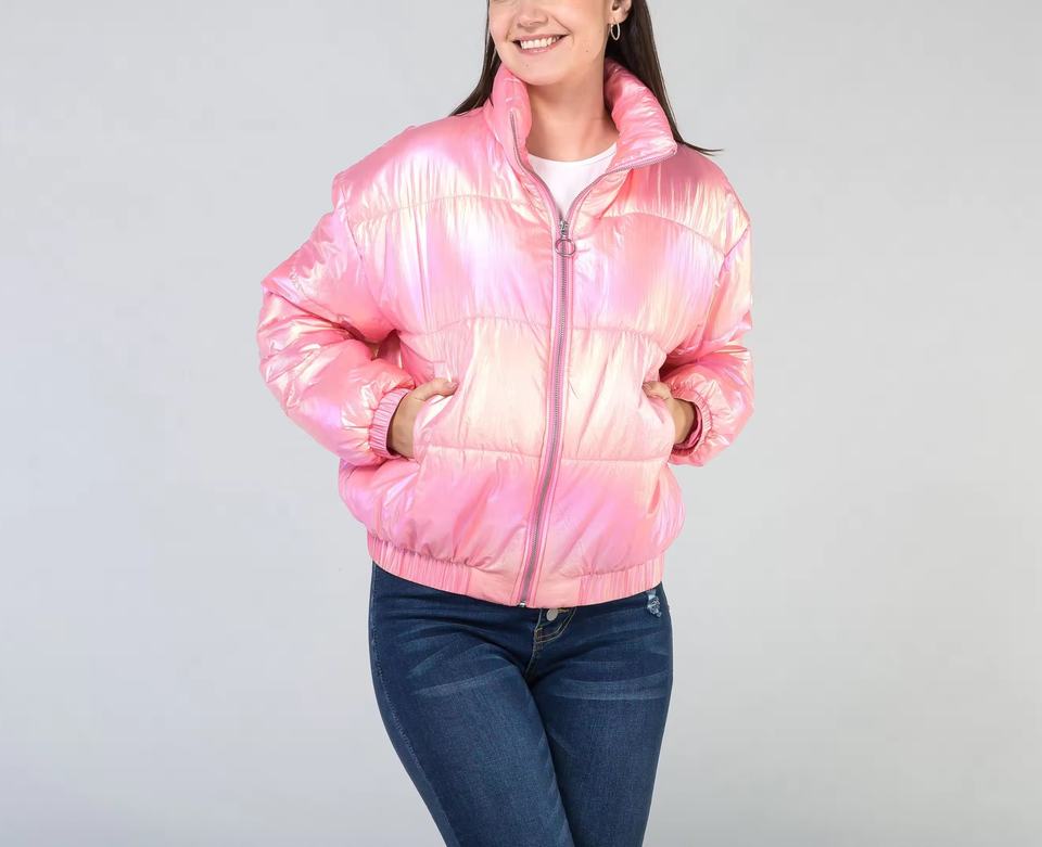 แจ็กเก็ตผู้หญิงขนเป็ดสีชมพูแวววาวออกแบบใหม่สไตล์ลำลองกันลมบุนวมระบายอากาศได้ดี